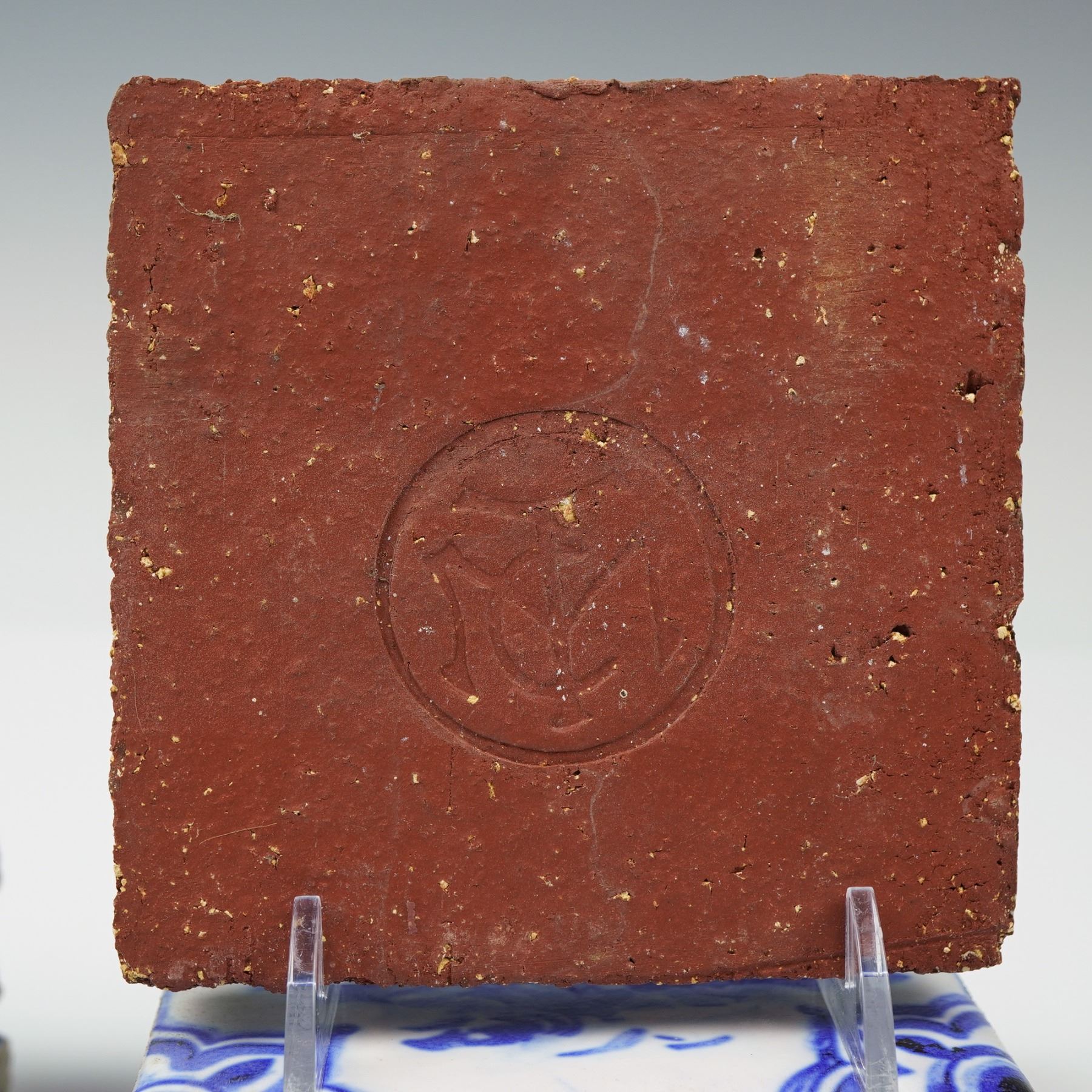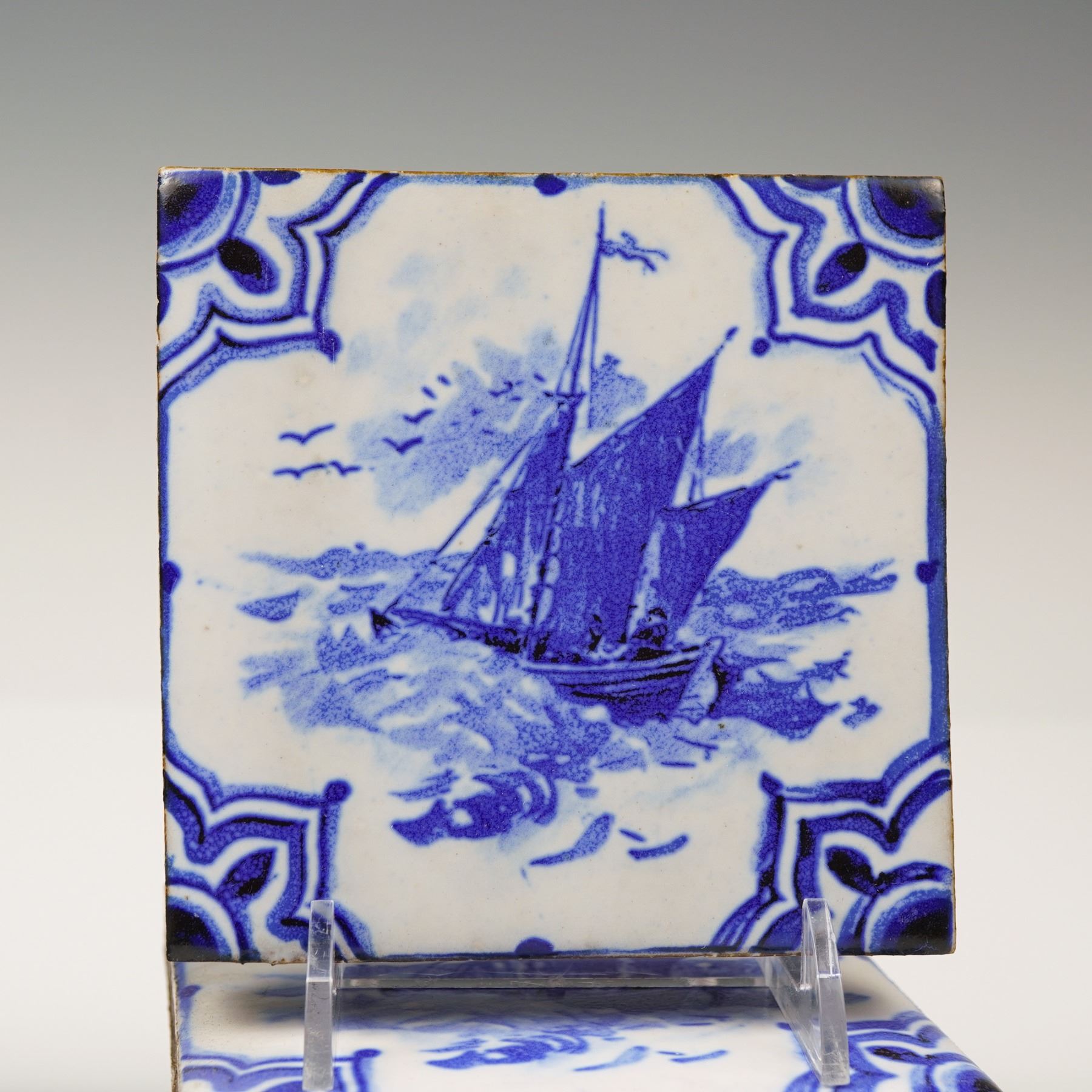 Each tile features a vivid blue sailboat gliding across an open sea framed by decorative motifs. The surface shows finely detailed sails and seabirds in flight, while the edges reveal raw red clay and glaze drips. These tiles display a satin finish and varying traces of age. The back of each tile bears an impressed MTC mark in a circular seal.