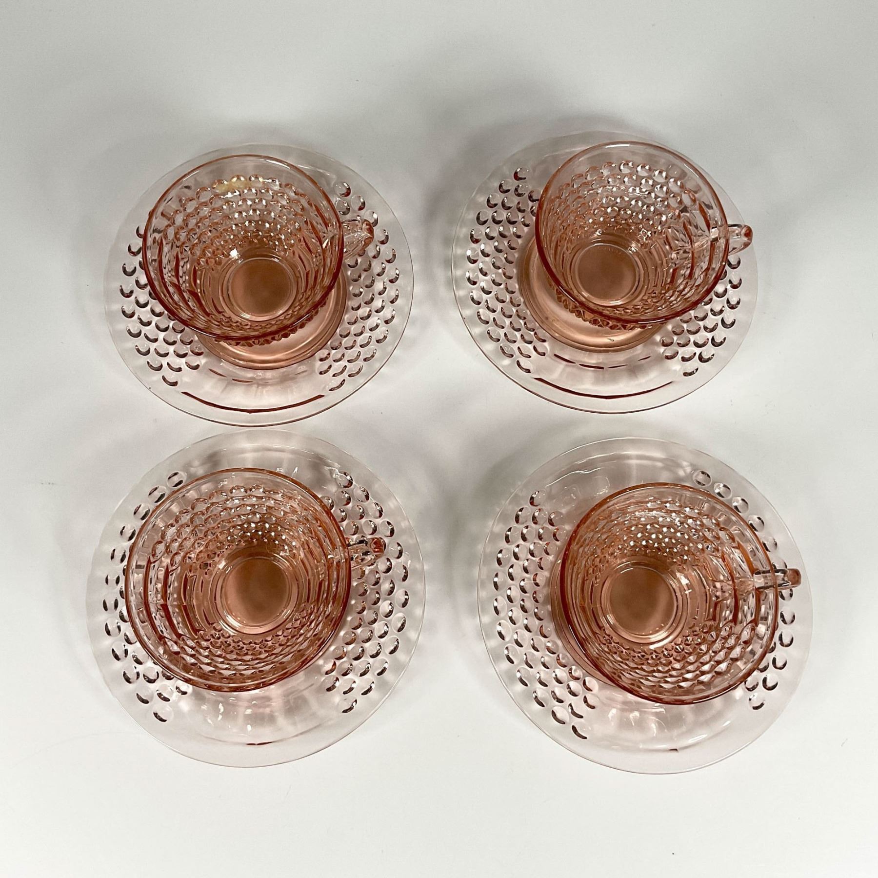 Set of Depression style pink glass coffee cups and saucers, adorned with protruding dot patterns covering the entire surface. Coffee cup: 4.5"L x 4"W x 2.5"H. Saucer: 6.5"W x 1"H.