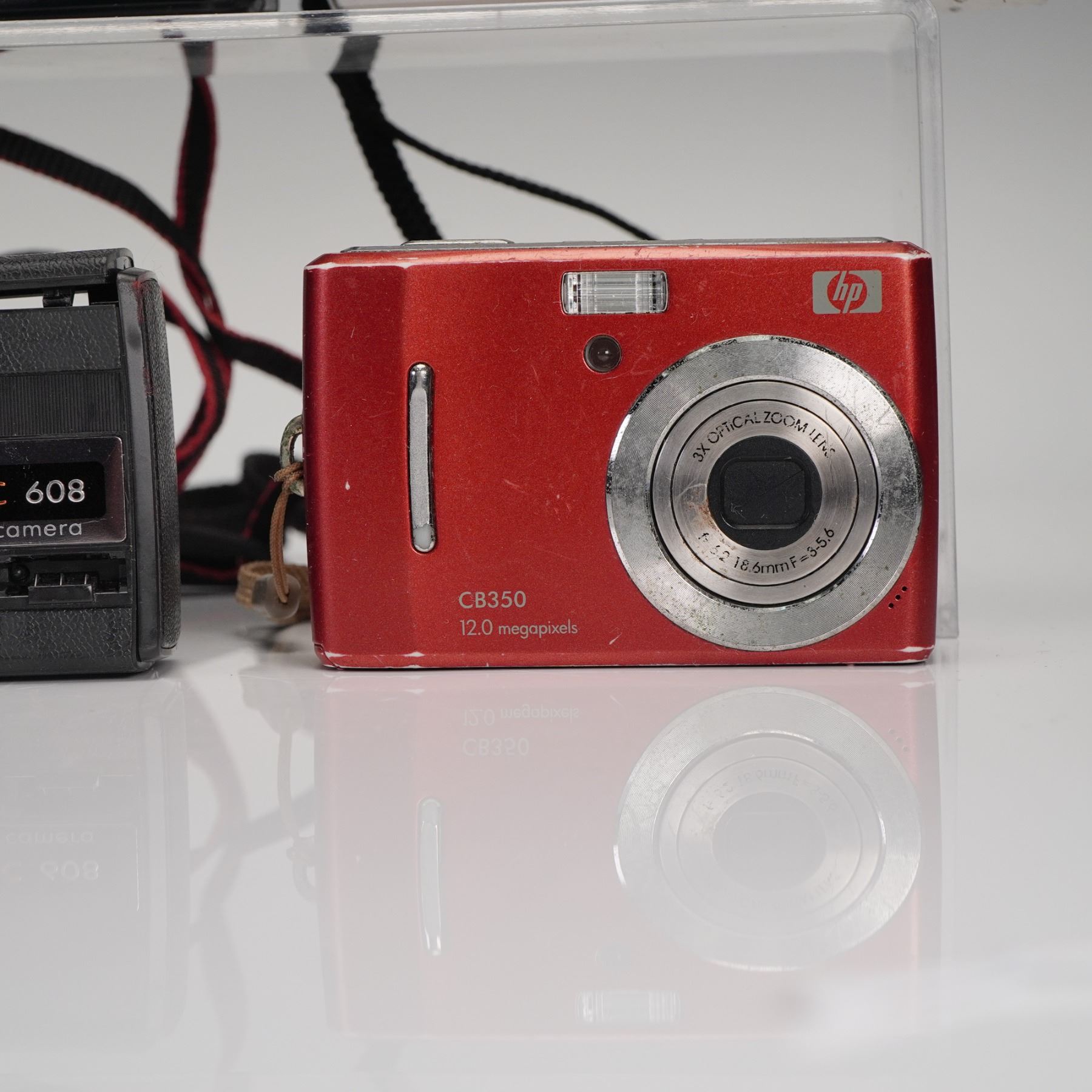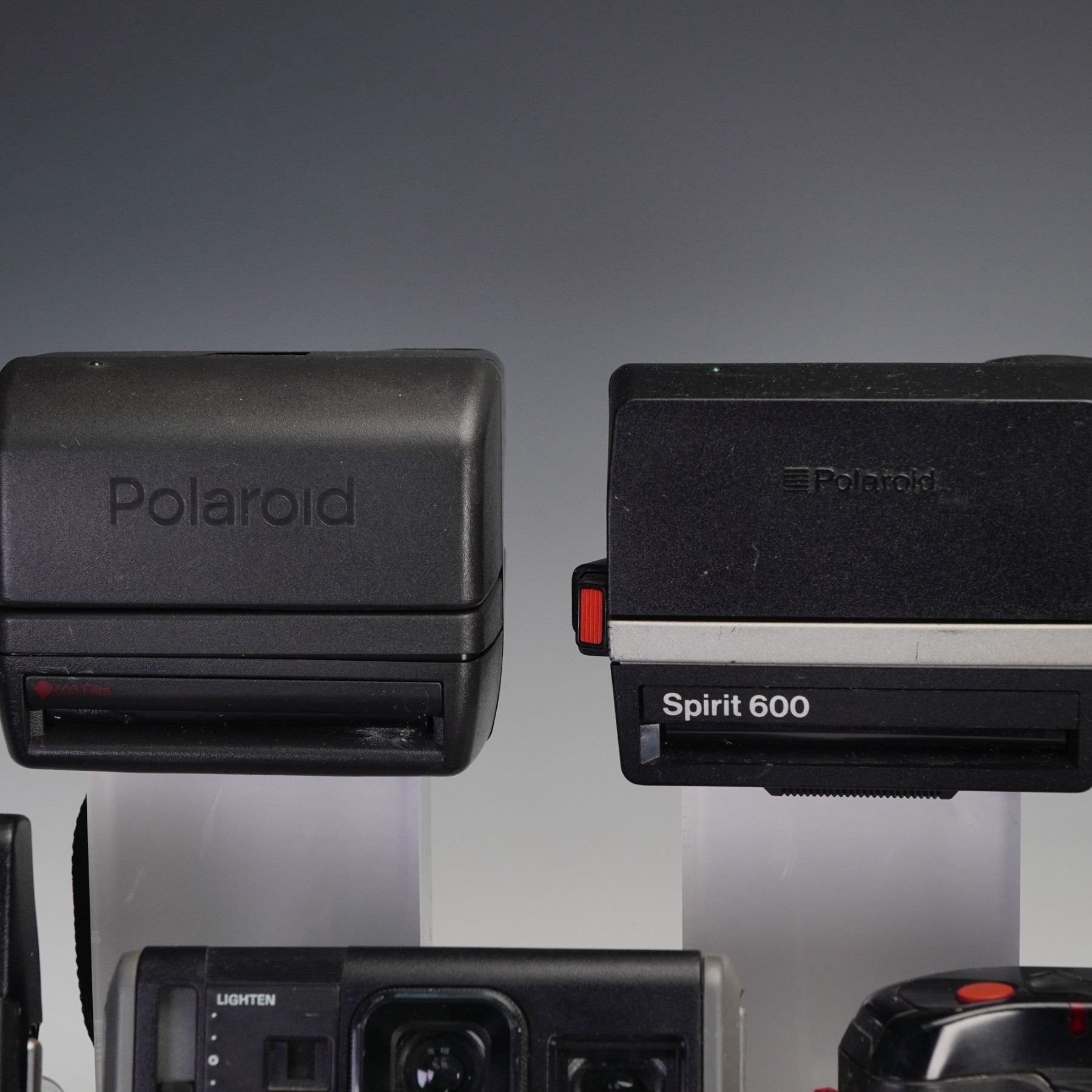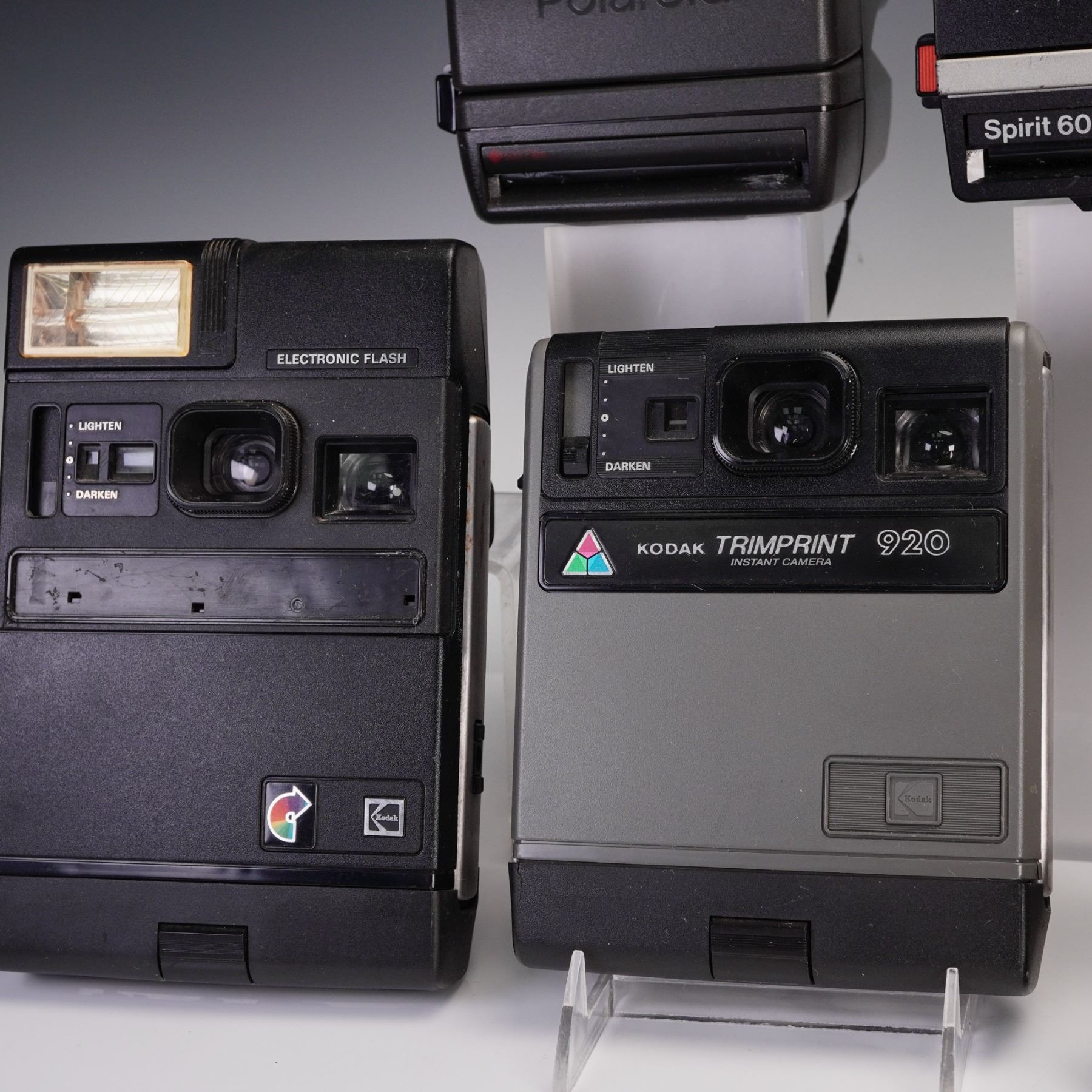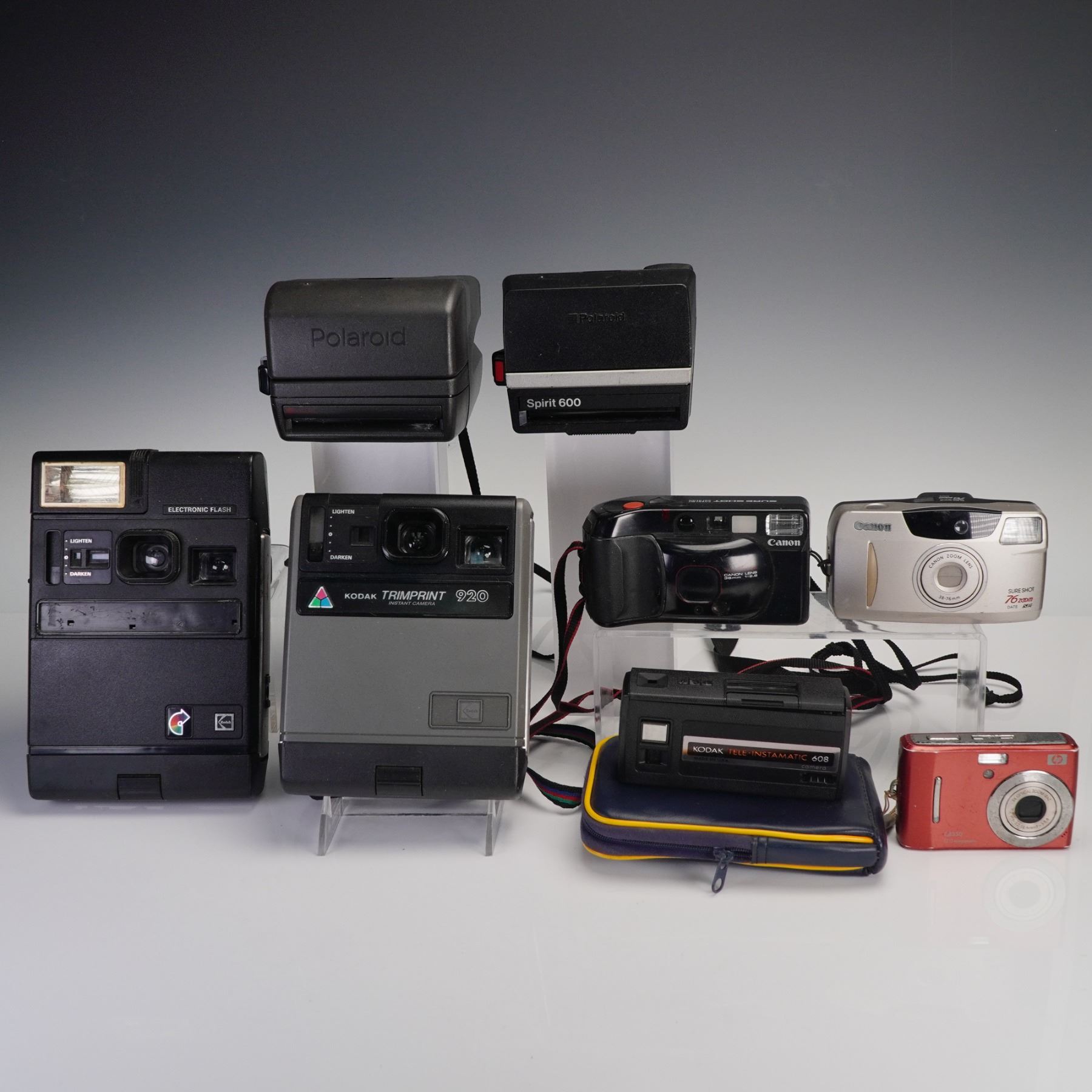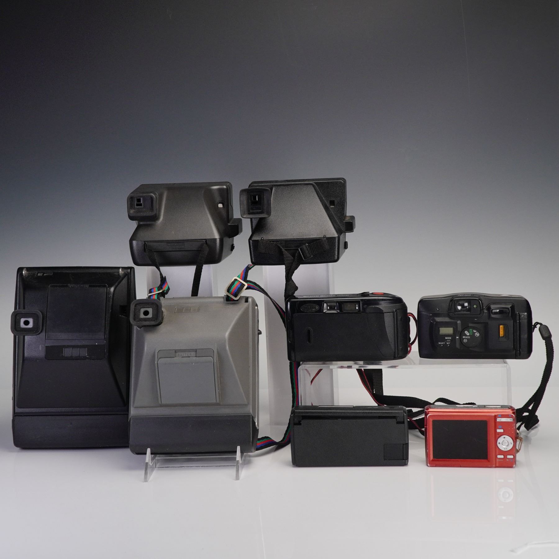 Assorted lot of eight vintage and retro cameras, including Polaroid, Kodak, and Canon models. Great variety for collectors, display, or photo props. One Kodak camera comes with an original Kodak pouch.