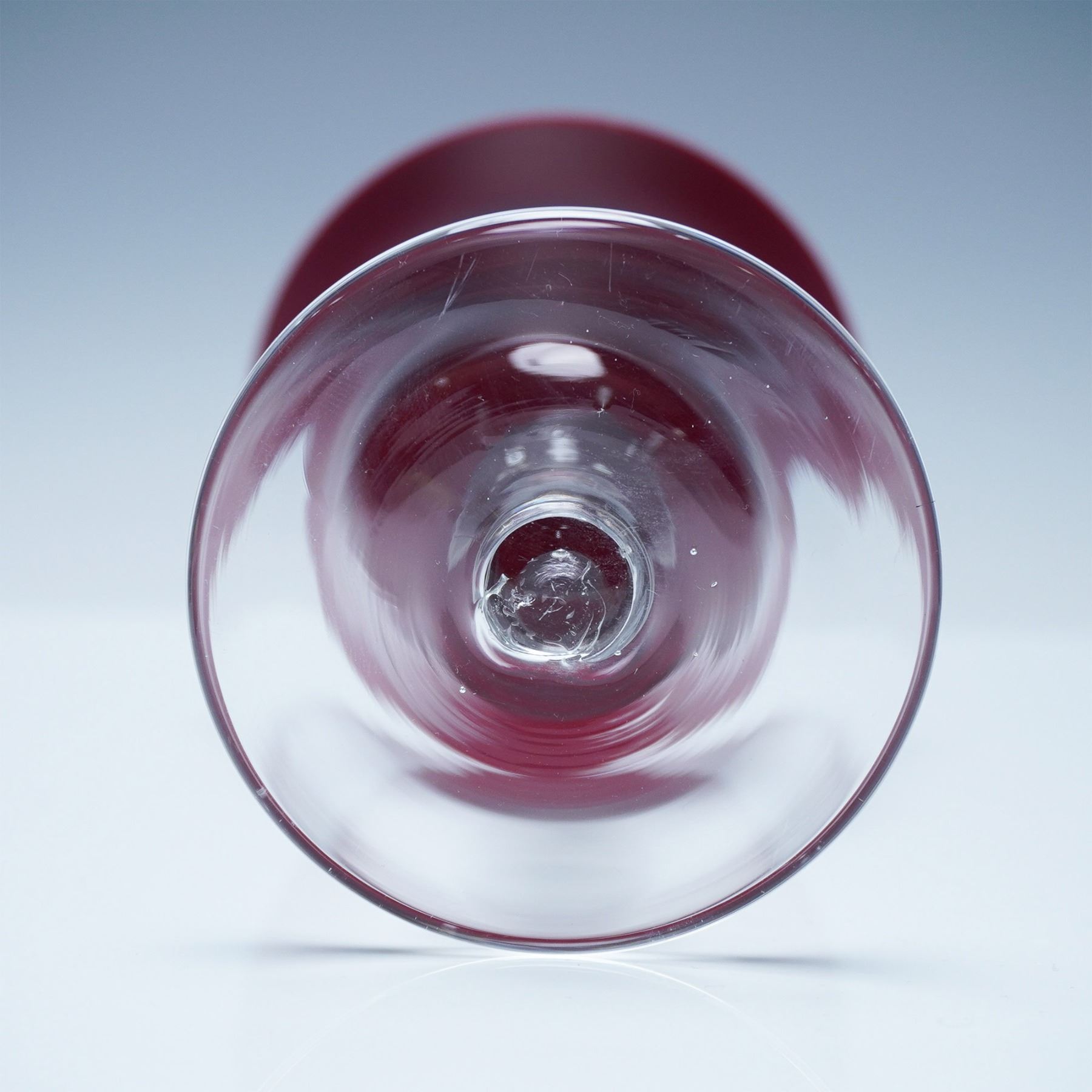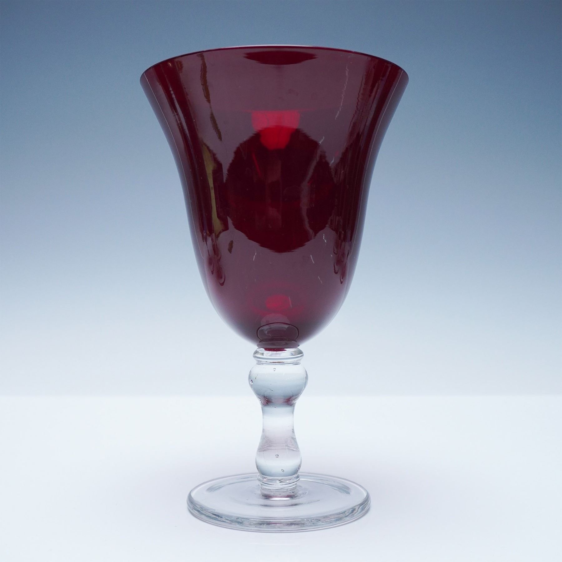 A set of eight elegant ruby red glass water goblets featuring a deep, rich red bowl contrasted by clear, baluster-style stems. These goblets exhibit fine craftsmanship with smooth contours and a gracefully flared rim. Their vibrant hue and timeless design make them an ideal addition to any glassware collection or table setting. Each goblet measures 7.25"H x 4.5" diameter.