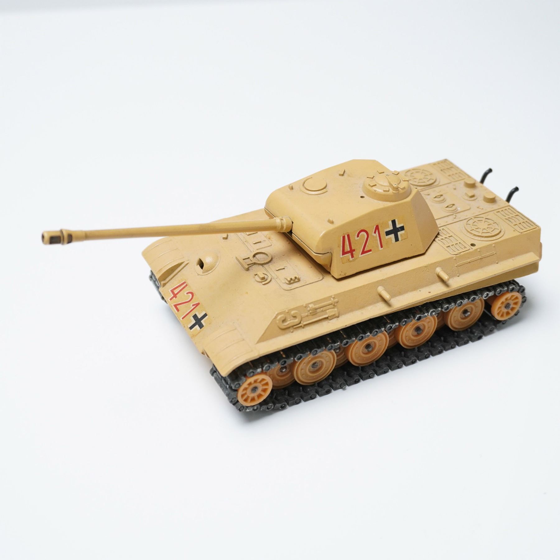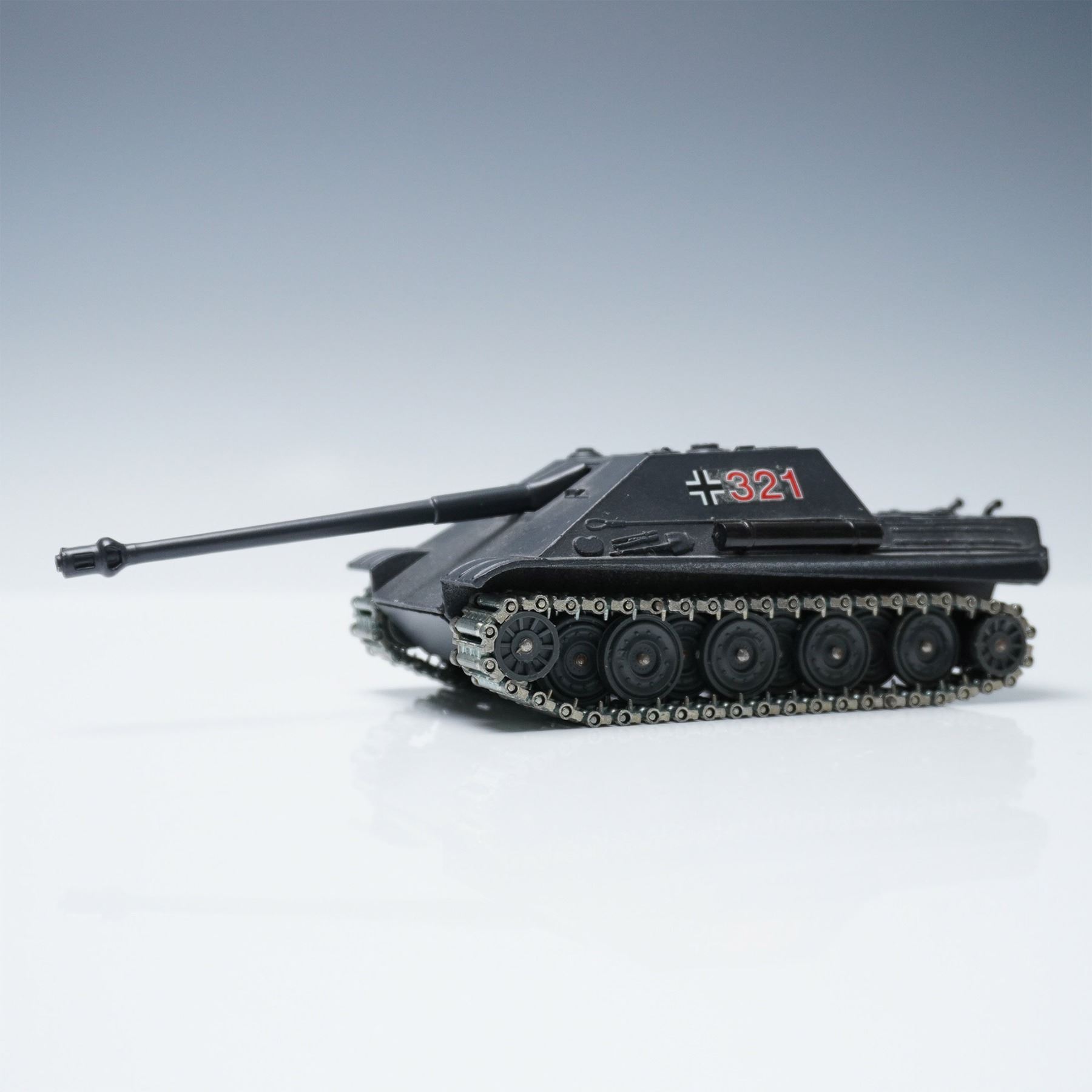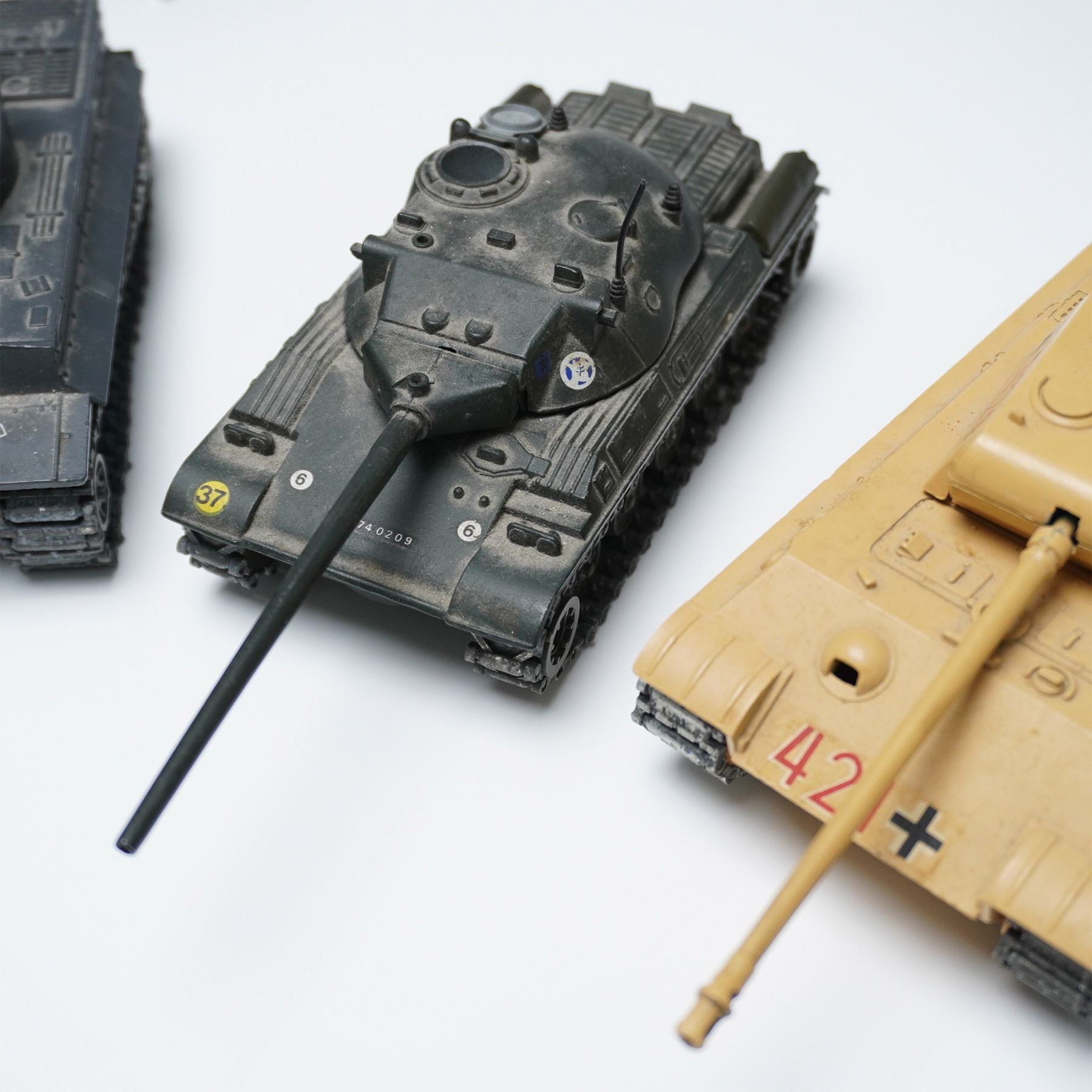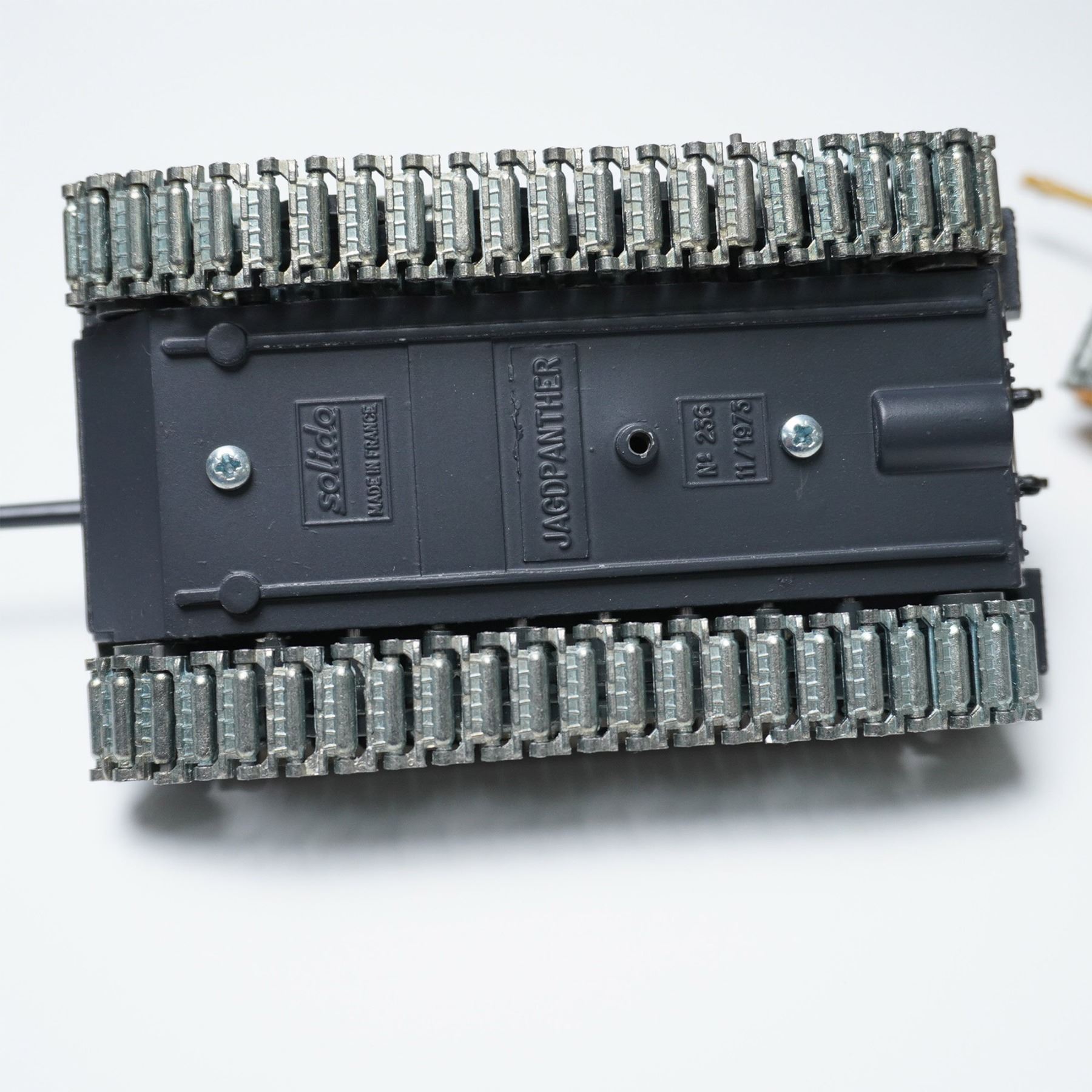 A collection of eight vintage die-cast military tank models by Solido, featuring a mix of WWII-era armored vehicles. The lot includes various tank destroyers - Panther G, Char Tigre, and JagD Panther - heavy tanks, and battle tanks in different camouflaged and painted schemes. Models are finely detailed, with movable turrets and rolling tracks. Some tanks are marked with identifying insignia and numbering, and the undersides bear Solido branding and model numbers. Condition varies with light signs of wear appropriate to age.