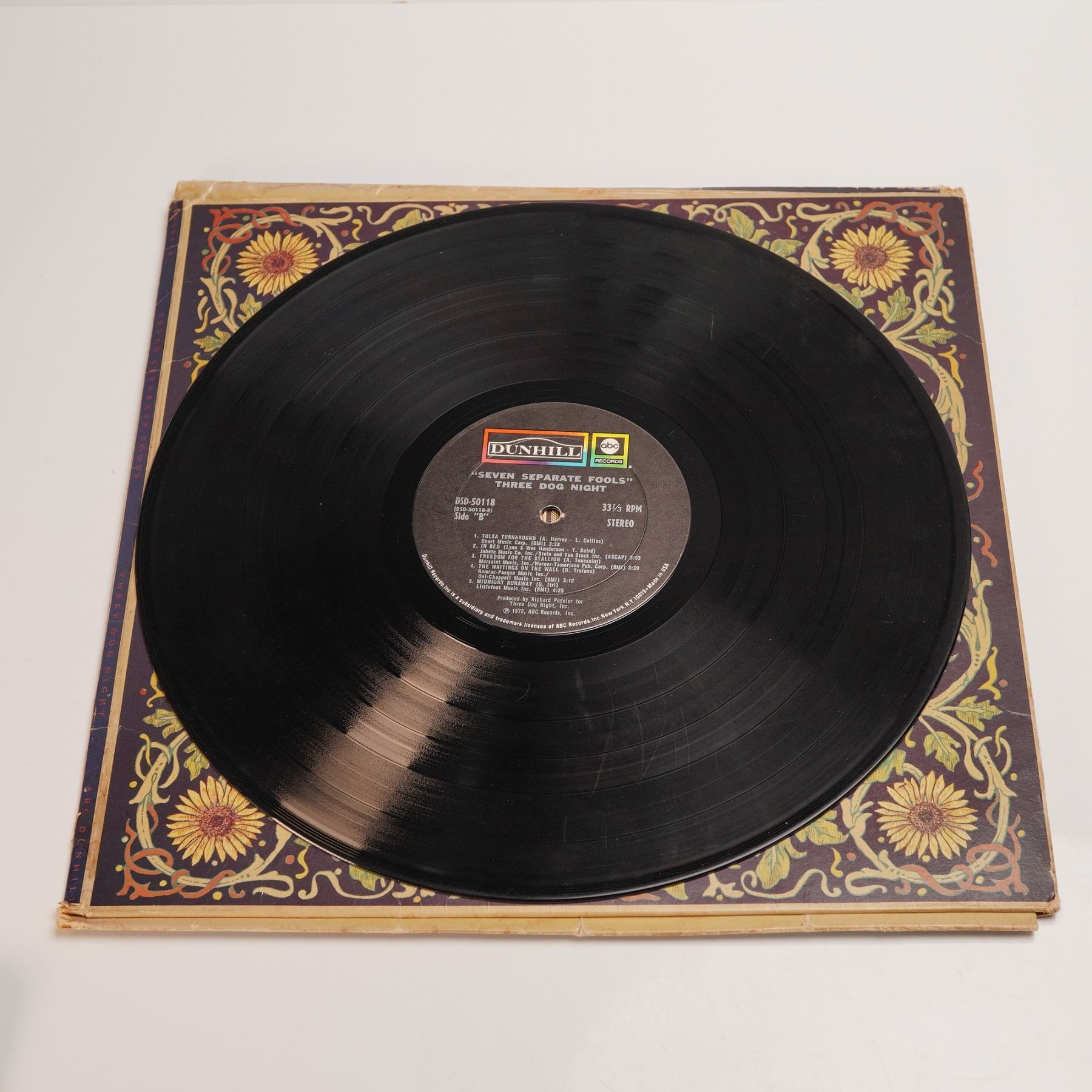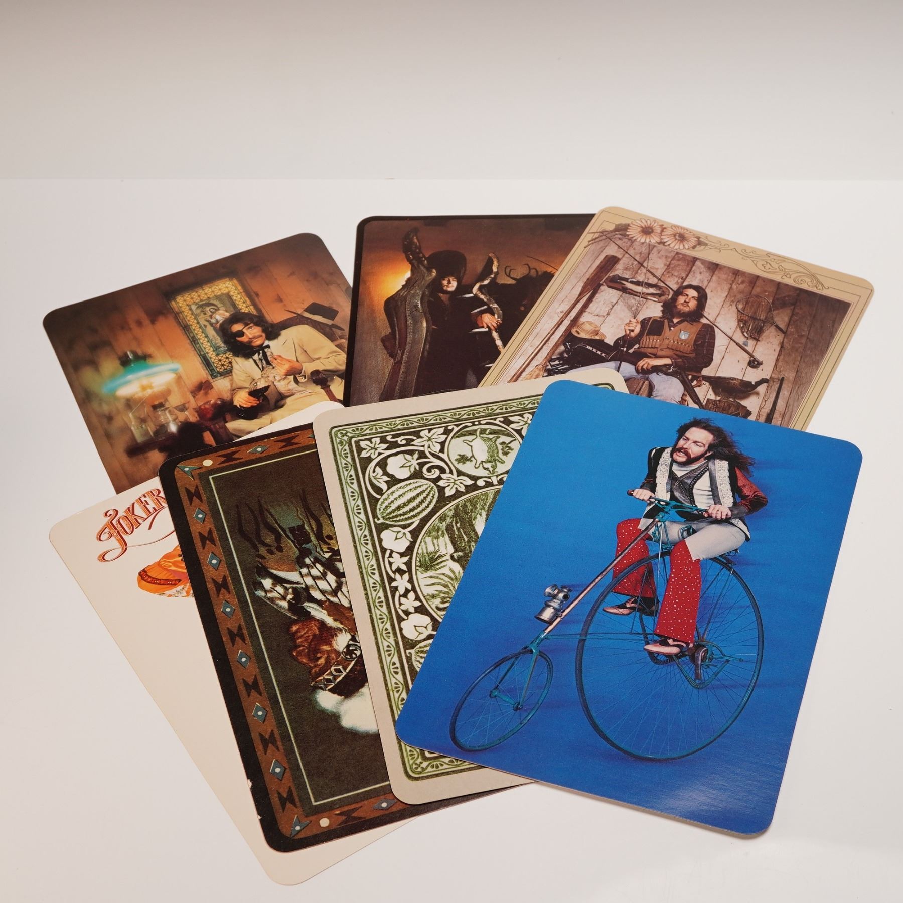 Three Dog Night Seven Separate Fools LP with Playing Card Inserts. 1972 Dunhill Records pressing featuring the complete set of seven oversized fool playing cards with theatrical portraits of the band members. Includes original gatefold jacket with floral Art Nouveau-style design. Features hits like Black and White and Pieces of April. A standout collectible for fans of 70s rock and quirky album art.