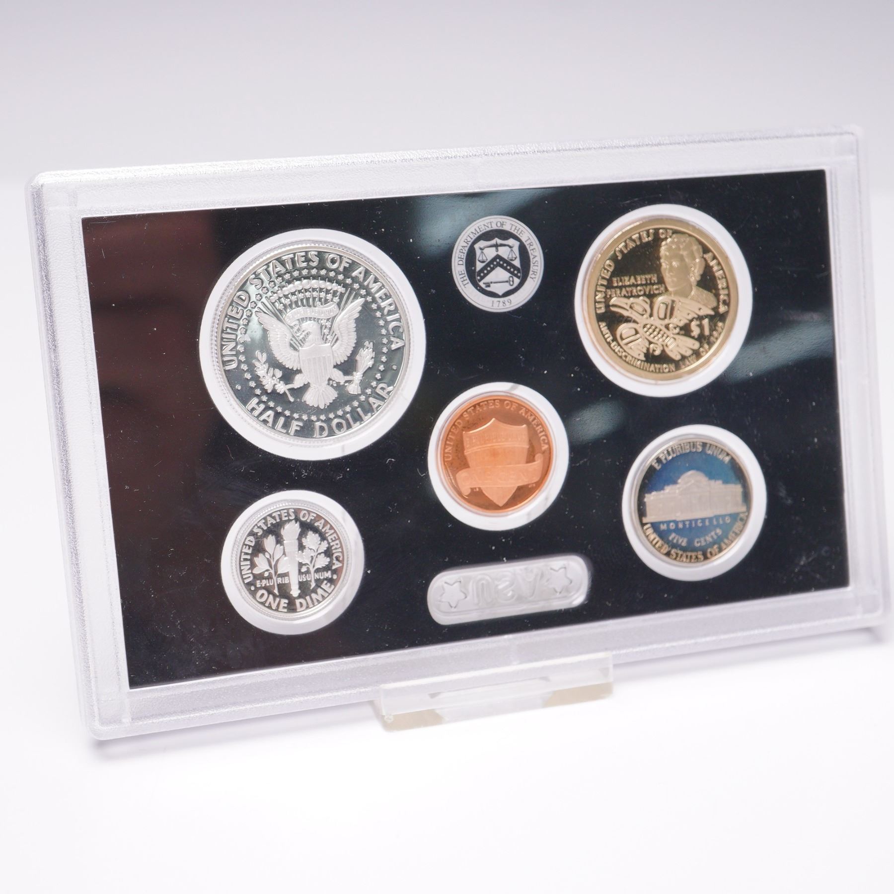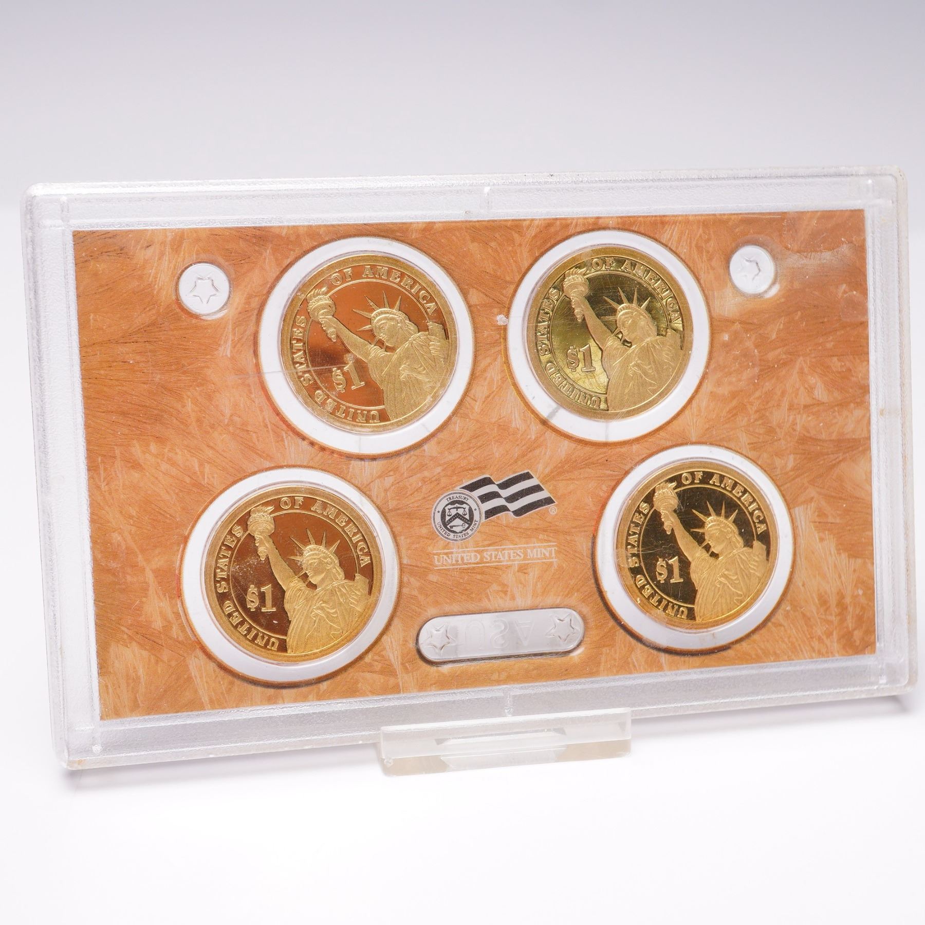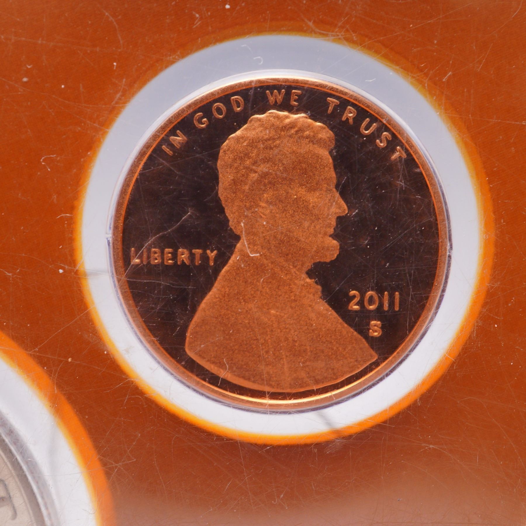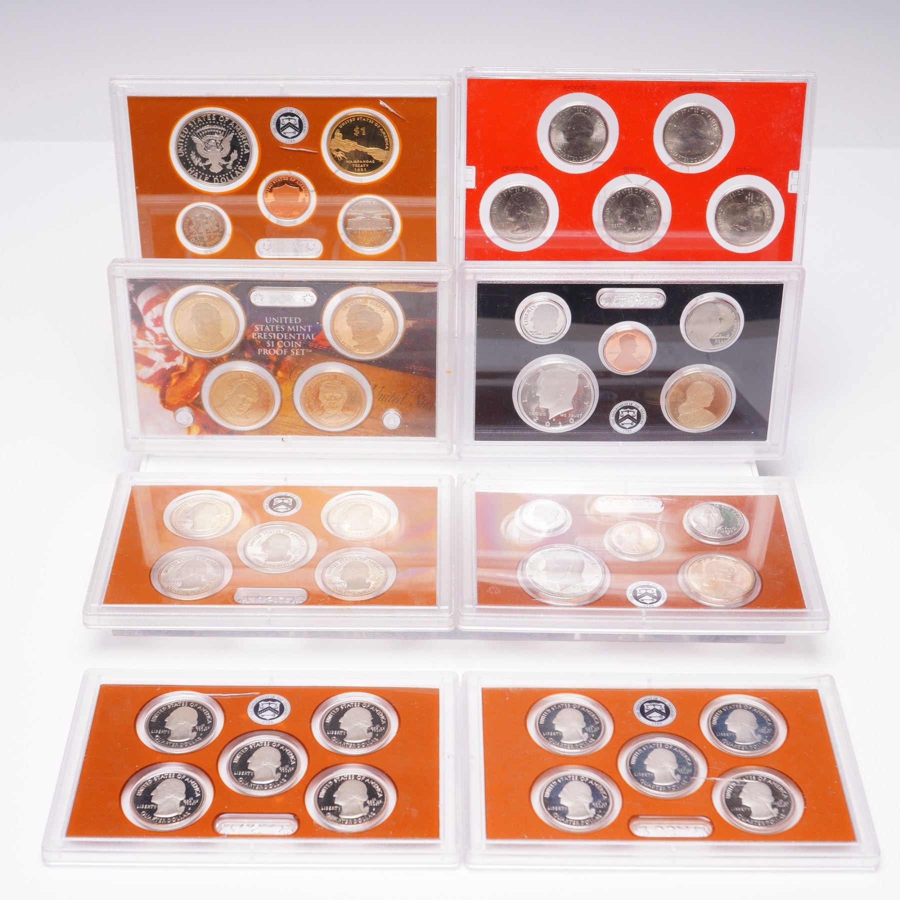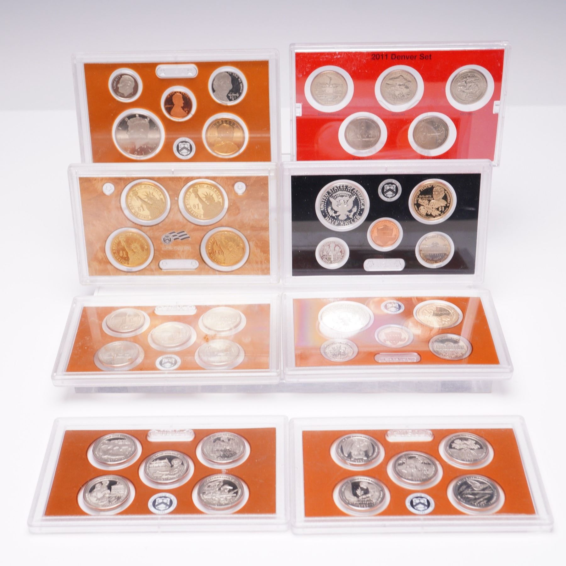 Group of eight official U.S. Mint coin sets from 2011 to 2020, including 2pc complete annual brown-background proof sets with cent through dollar coins, 3pc State Quarters proof sets in brown packaging, 1pc Presidential $1 proof set, 1pc black-background full proof set featuring all denominations including the Sacagawea dollar, and 1pc red-background 2011 Denver Mint uncirculated coin set. Coins include Lincoln cents, Jefferson nickels, Roosevelt dimes, Washington quarters, Kennedy half dollars, Presidential dollars, and Native American dollars, with designs from the State Quarters and America the Beautiful series. All coins remain sealed in original U.S. Mint display cases with printed inserts and certificate of authenticity. Coins measure approx. 19mm to 26.5mm dia. Each case measures approx. 5.5"W x 3.25"H.