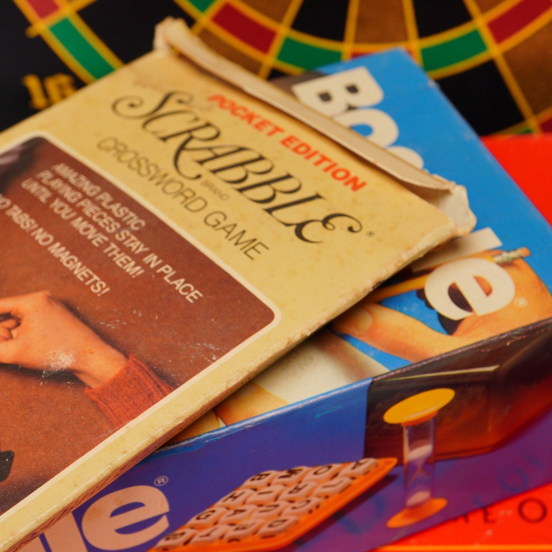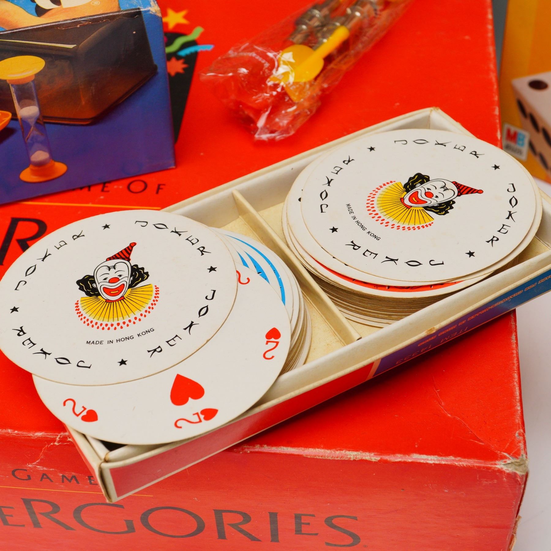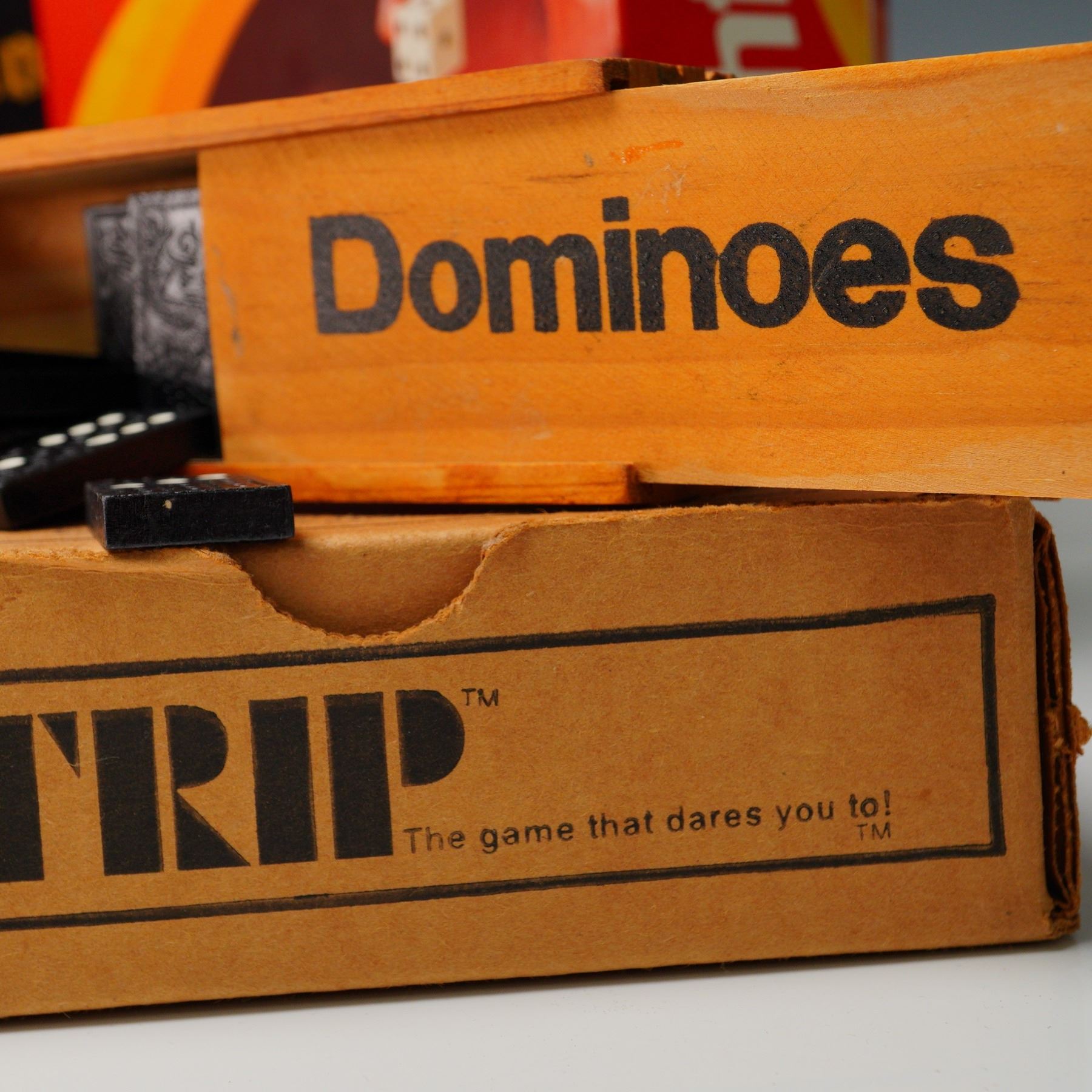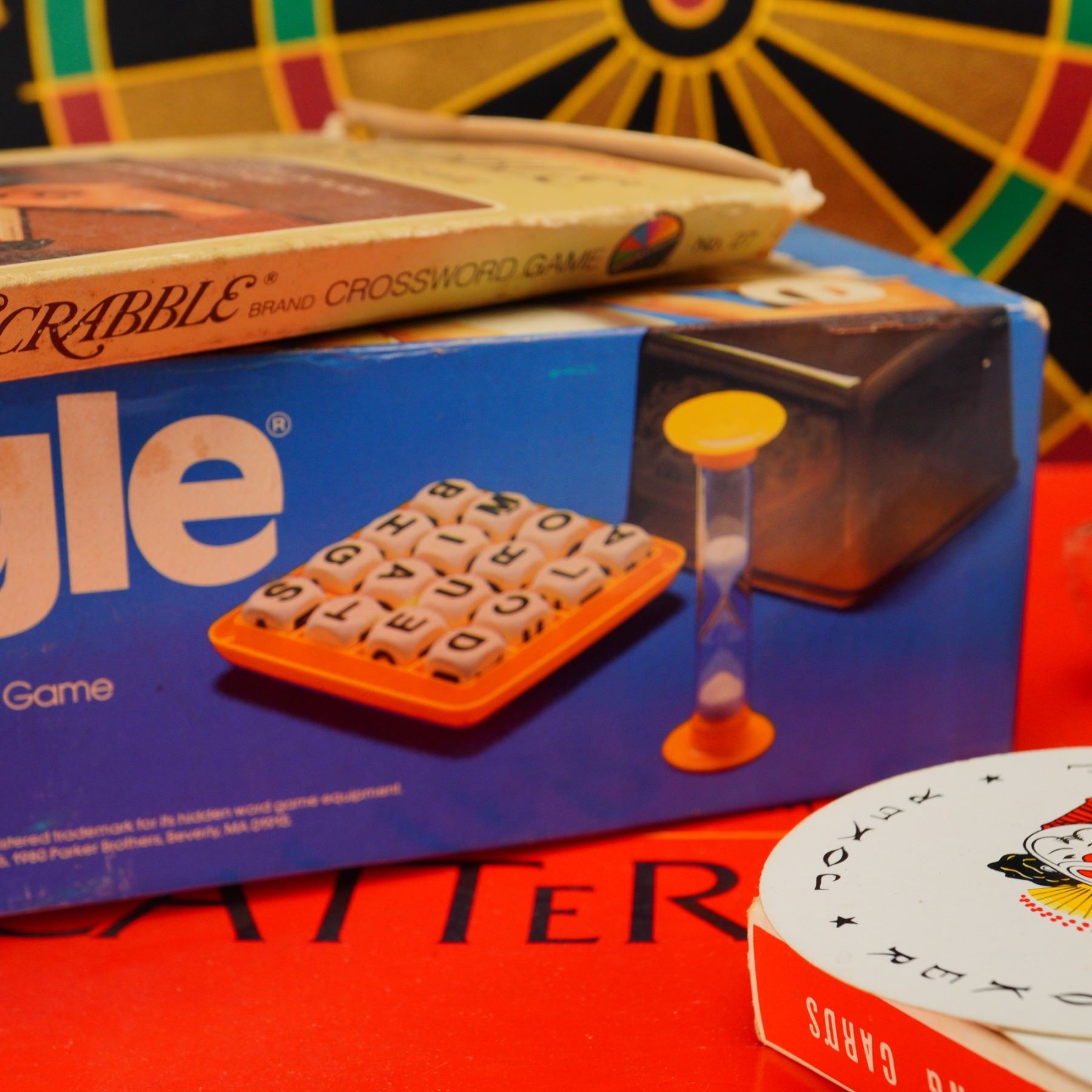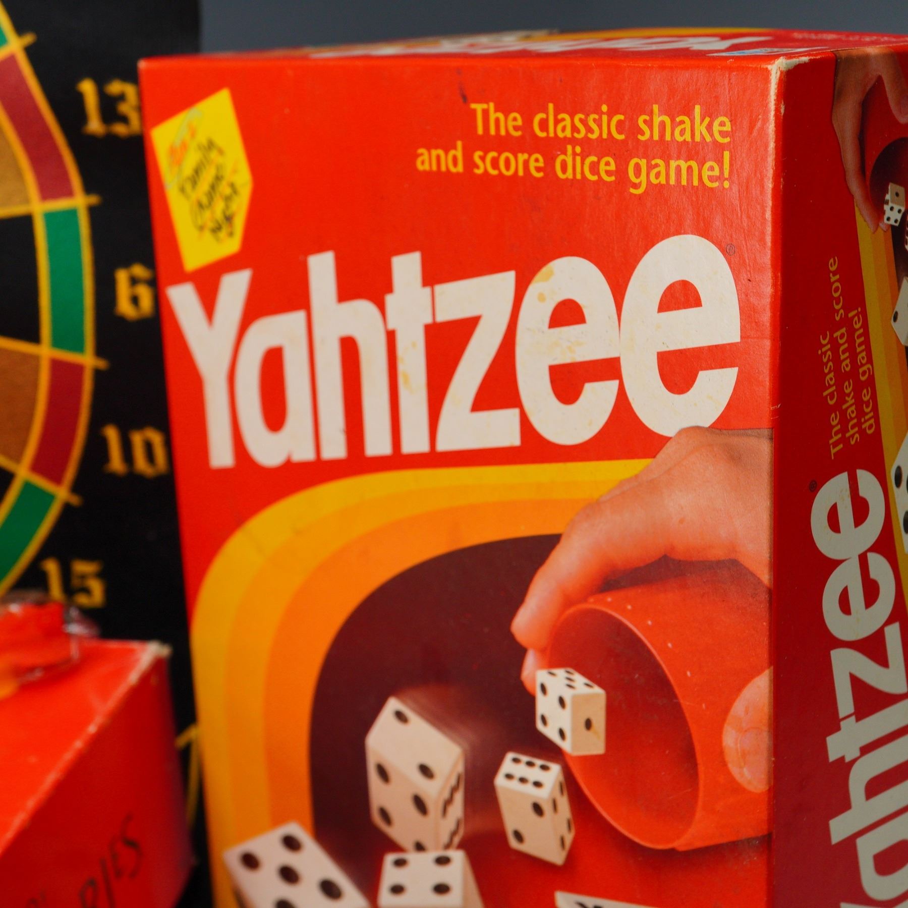 A nostalgic 8-piece lot of vintage family and parlor games, including Yahtzee, Scattergories, Boggle, and a pocket edition of Scrabble. Also included are a soft dartboard, a wooden domino set, round playing cards, and a set of Strip playing dice. This throwback collection captures the spirit of classic game nights with a mix of wordplay, luck, and low-stakes mischief.