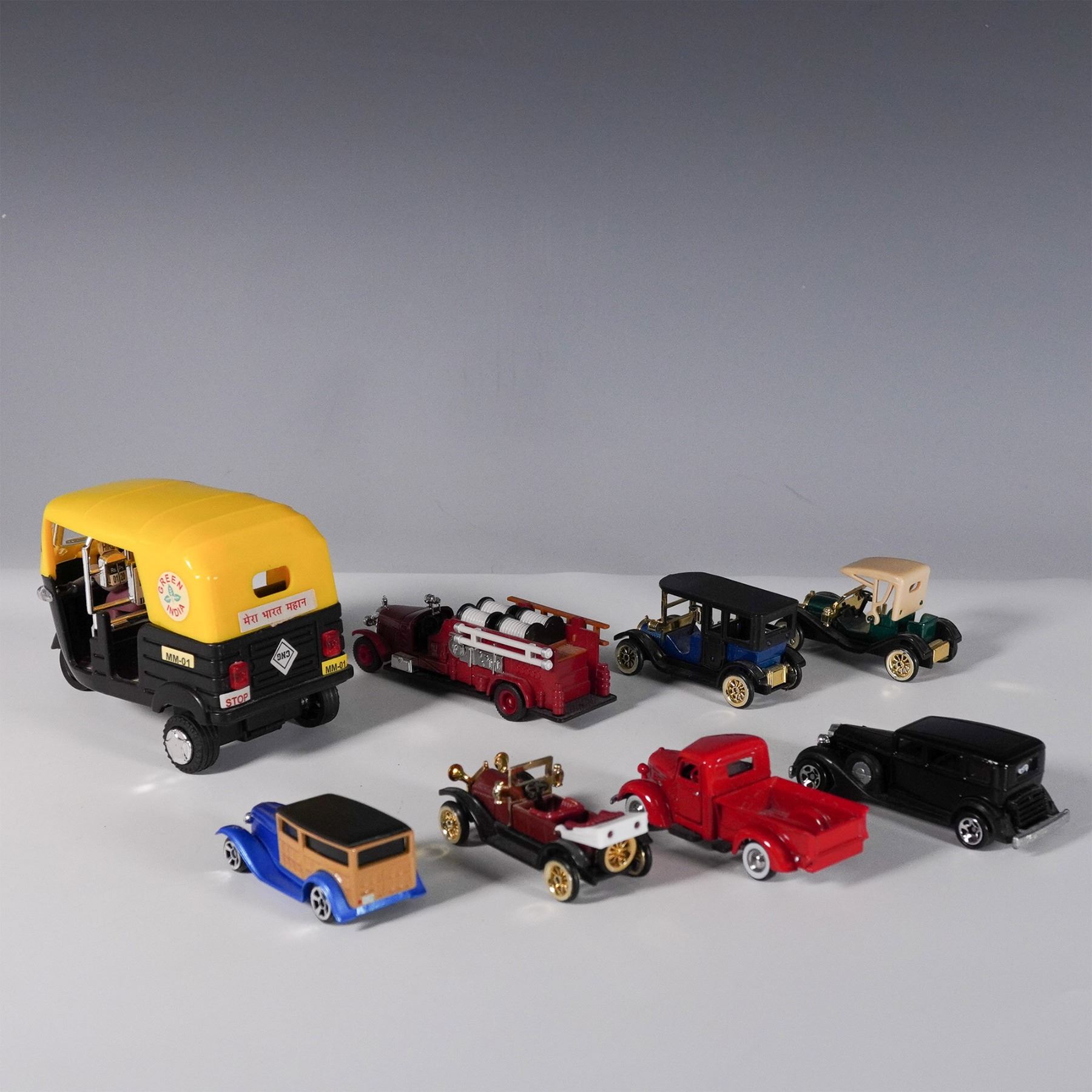 This 8-piece vehicle model set features a mix of diecast and plastic classic cars, fire trucks, and taxis, showcasing diverse designs from early automotive history. The collection includes a yellow auto rickshaw taxi, a red fire truck, vintage luxury sedans, and early 20th-century automobiles with gold-accented details. Some models are primarily plastic, while others incorporate diecast metal for added durability. The largest vehicle measures approximately 4.5"L x 3"H. A unique and varied set, perfect for collectors and enthusiasts of classic and antique vehicles.