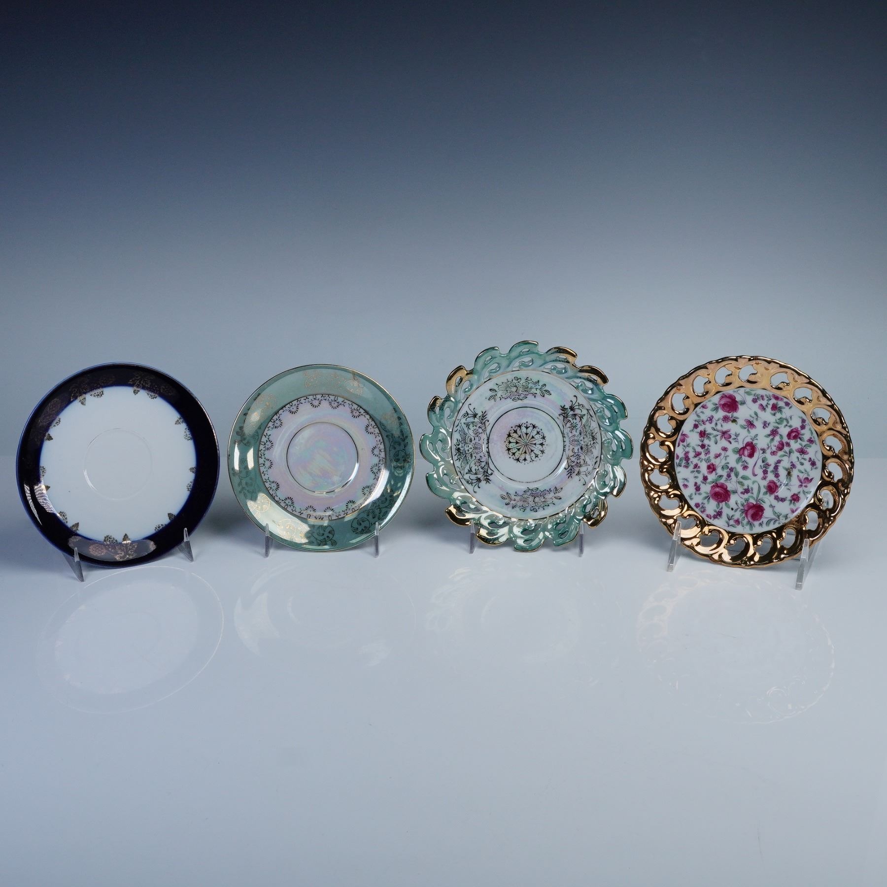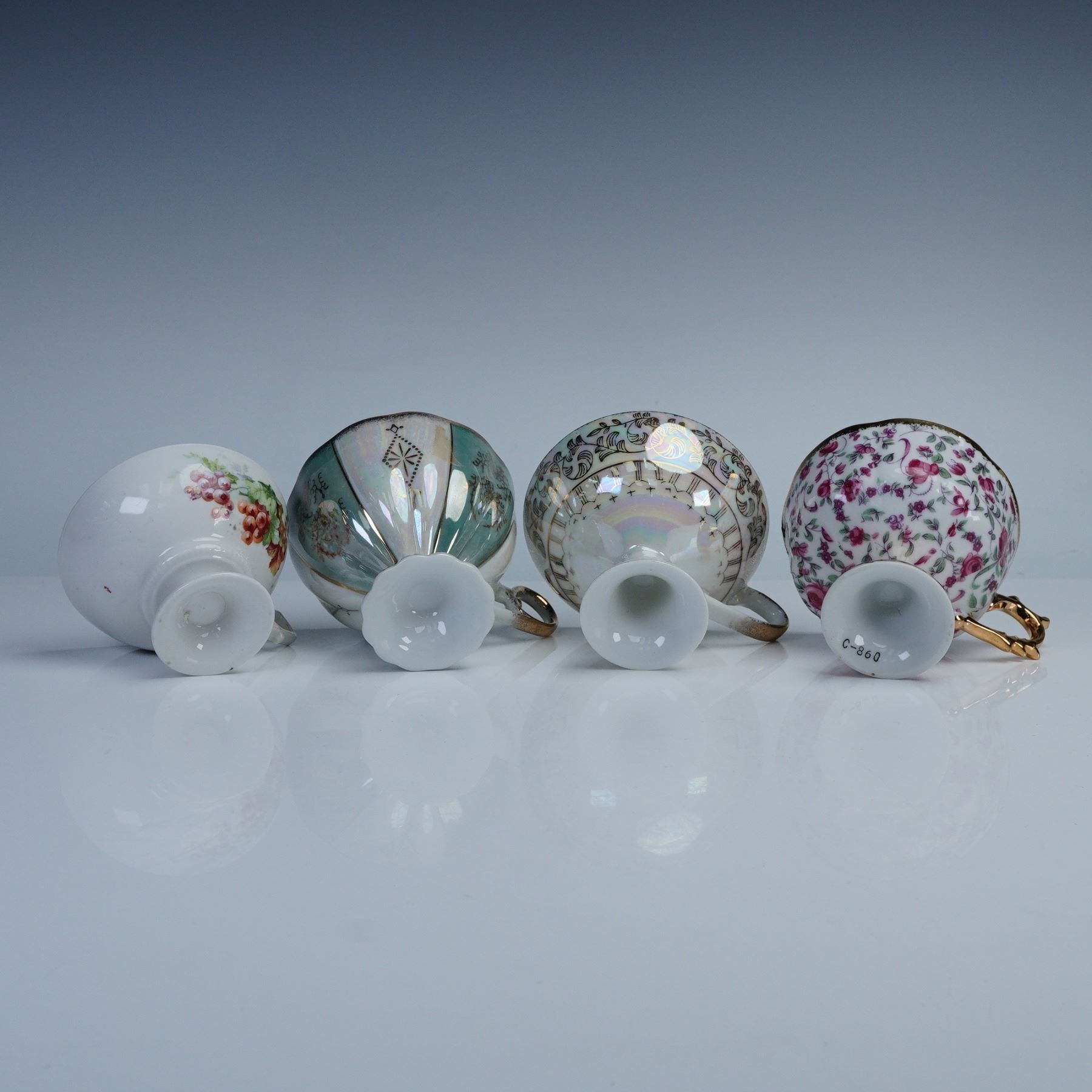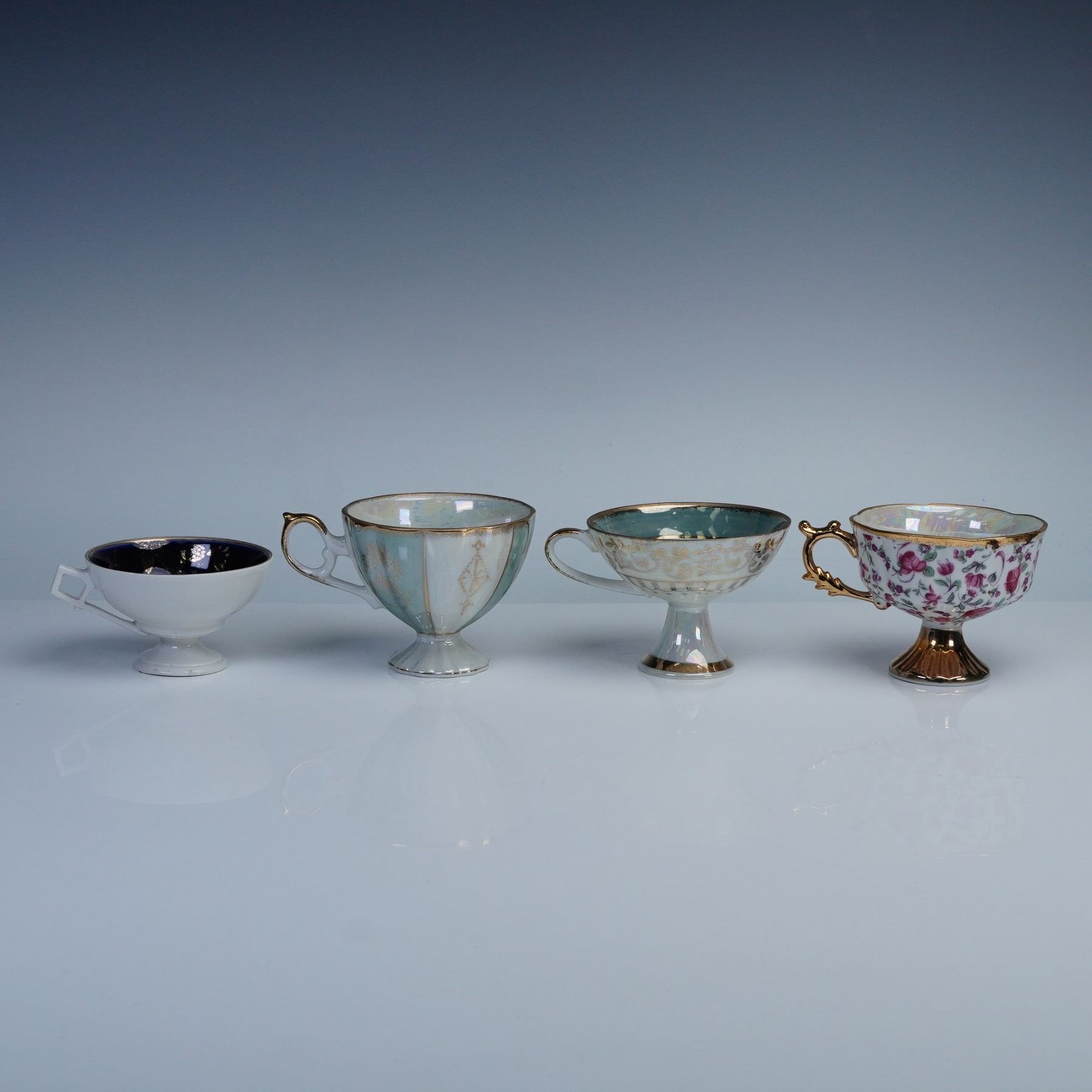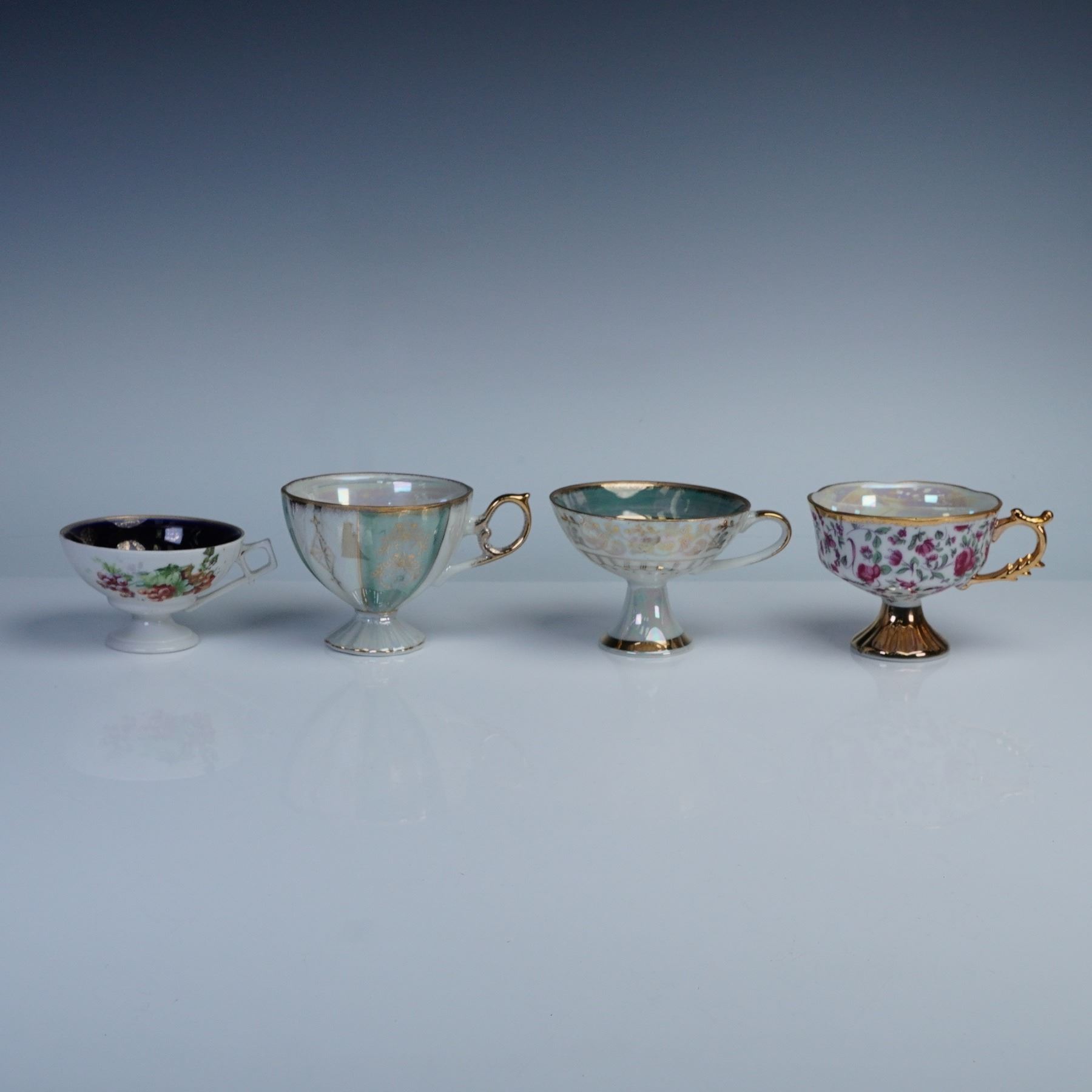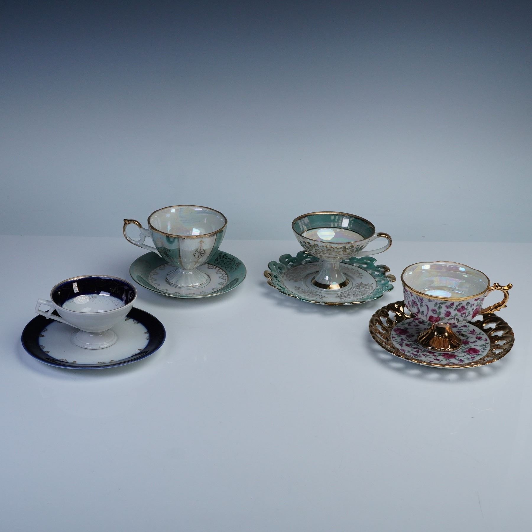 Assorted vintage lusterware cup and saucer set featuring four pedestal teacups with matching saucers in a mix of floral, scroll, and iridescent designs. Includes gold-gilded loop-handled cups and pierced saucers with mother of pearl glaze, floral sprays, and classical motifs. Two saucers bear backstamps marked Germany and Bavaria. A decorative and colorful grouping ideal for display or vintage tea service. Saucers measure approx. 5.5"dia. to 6.25"dia. and cups approx. 2.25"H to 3.25"H.