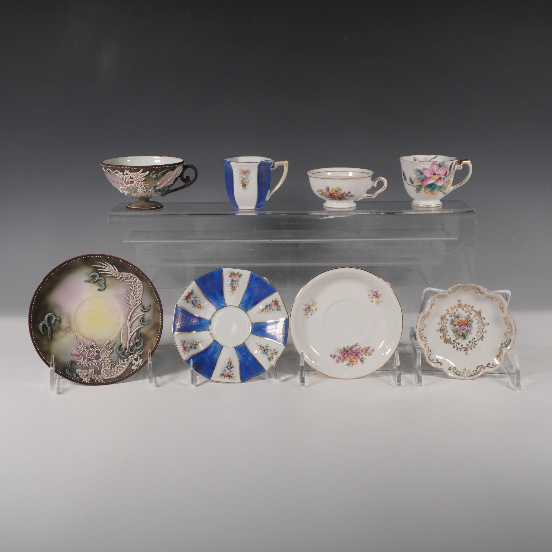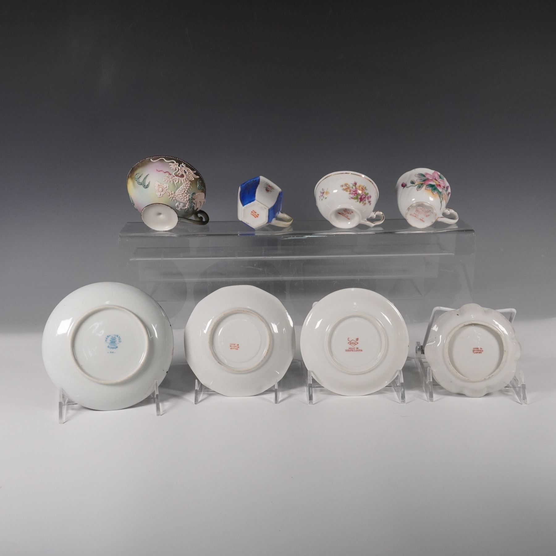 Collection of four vintage porcelain cup and saucer sets, each finely crafted and hand-painted during the Occupied Japan period (1945-1952). Featuring a variety of distinctive designs, including an intricate dragon motif, floral patterns, and elegant gilt highlights, these charming pieces exemplify mid-century Japanese artistry and aesthetic. Each set is individually marked Occupied Japan, reflecting their collectible historical significance. Largest item measures 4.25"L.