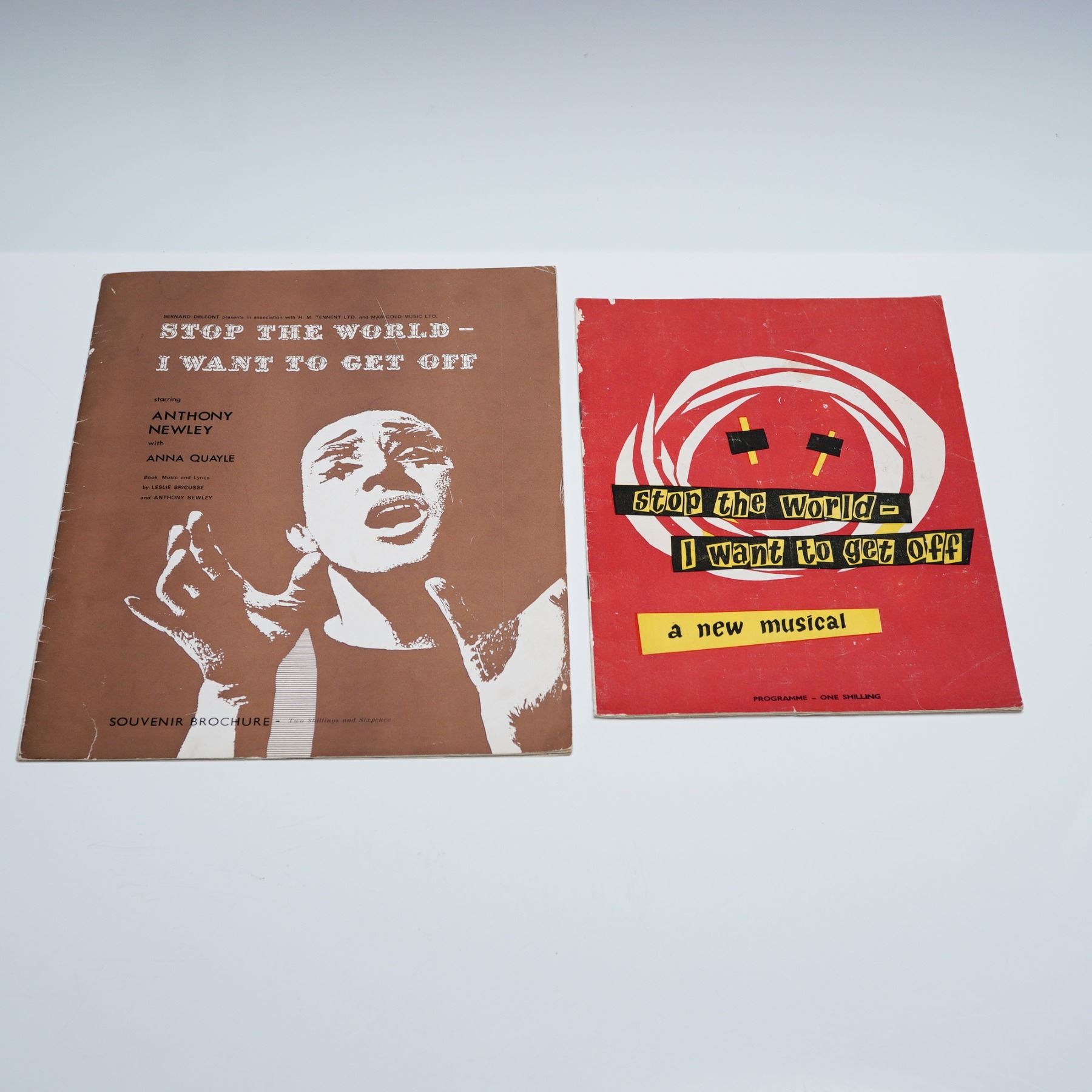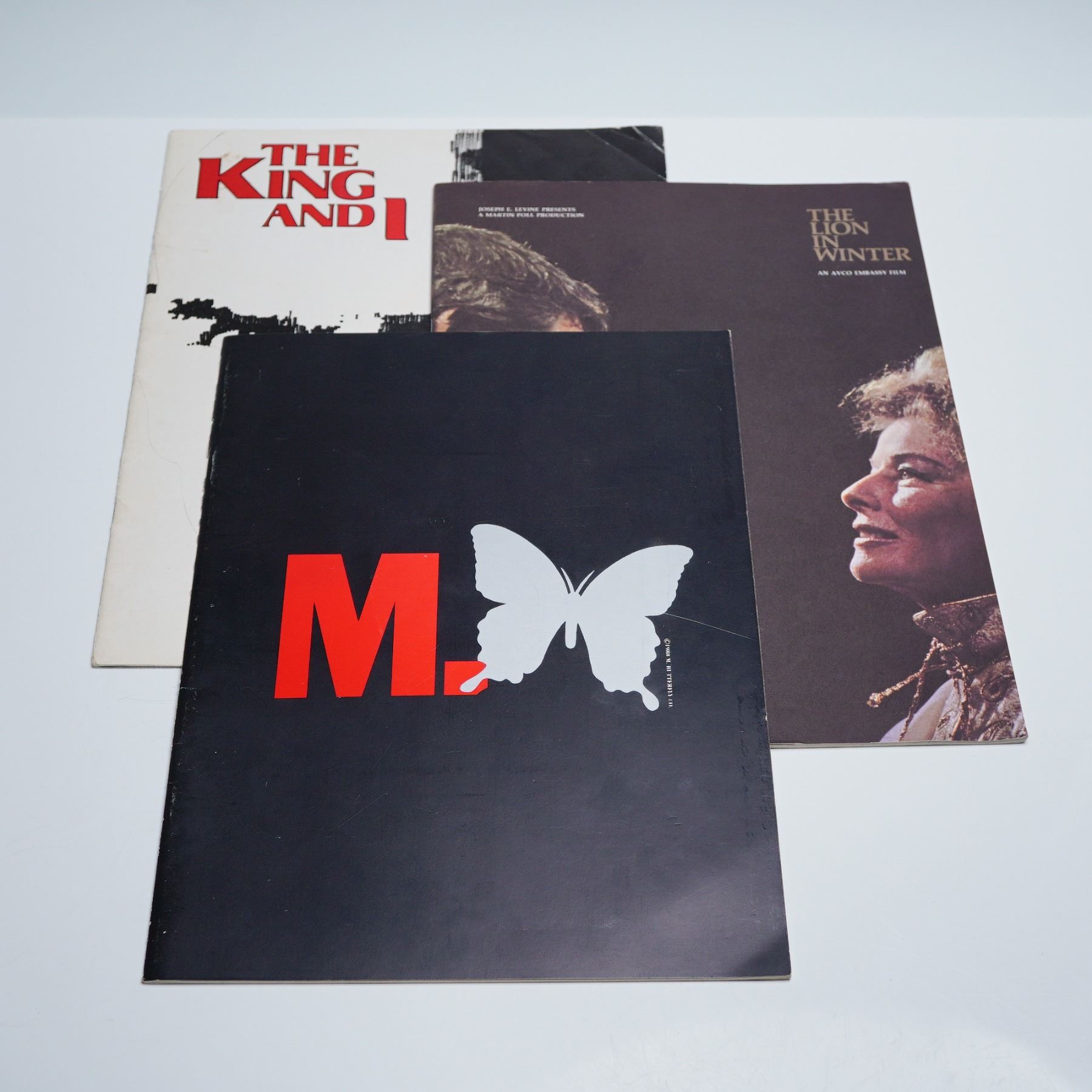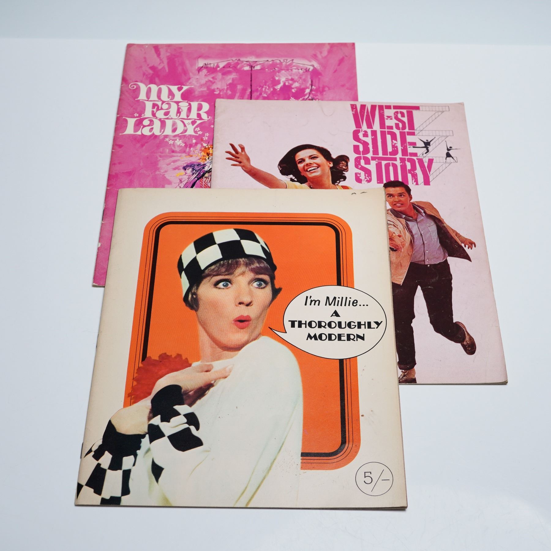 Group of eight vintage theatre souvenir programs and brochures from a range of classic musicals and plays. Titles include Stop the World - I Want to Get Off (two versions), My Fair Lady, West Side Story, Thoroughly Modern Millie, The King and I, The Lion in Winter, and Miss Saigon. Each features cast details, production credits, and vibrant period advertising, reflecting stage performances from the 1960s through the 1990s.