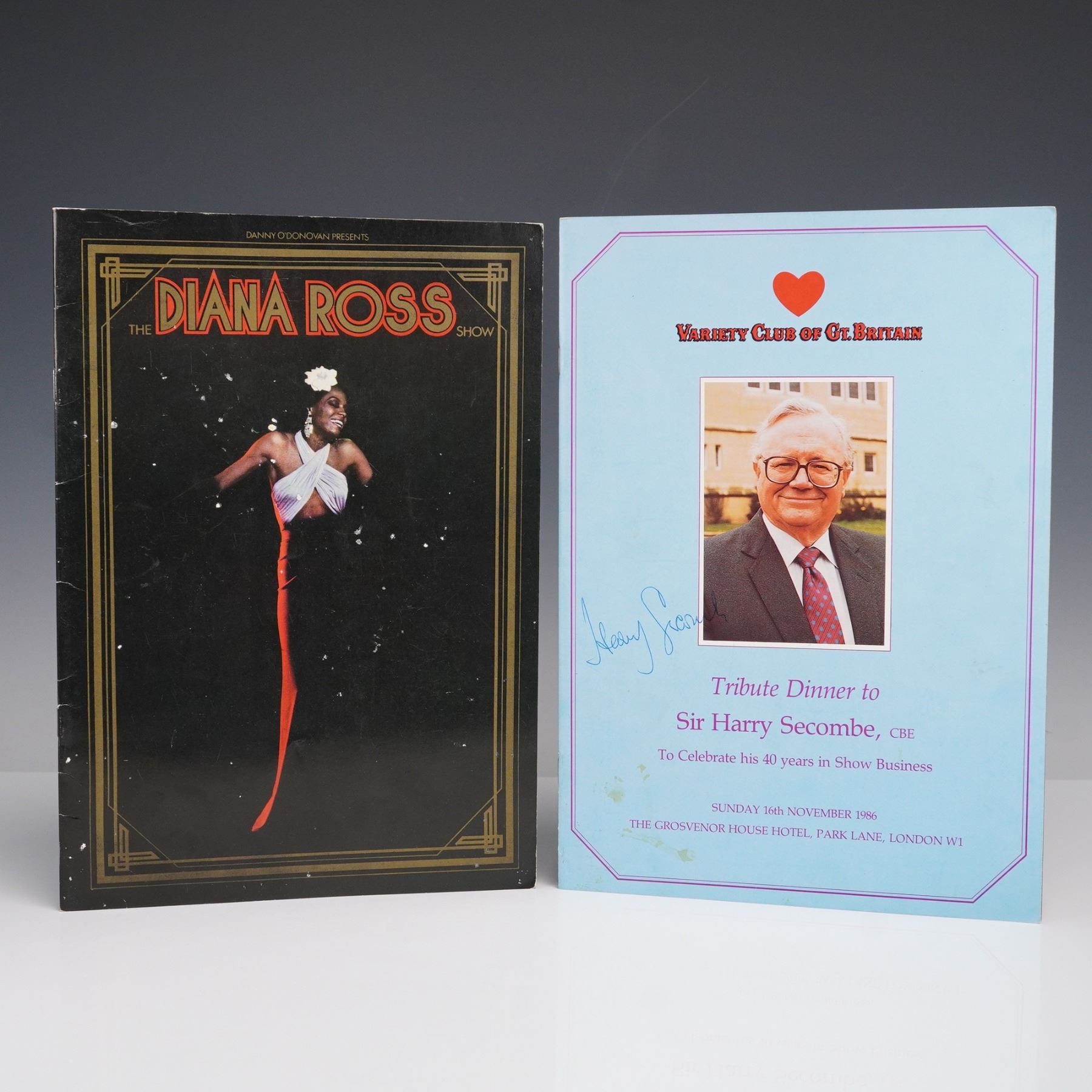 A fascinating mixed lot of eight original vintage programs spanning theater, concerts, and special events, offering a glimpse into 20th-century stage and screen history. Highlights include The Diana Ross Show, a glamorous souvenir program celebrating the Motown superstar at the height of her career, and a signed tribute dinner program for Sir Harry Secombe, CBE. Secombe, a beloved Welsh entertainer, was best known as a founding member of The Goon Show alongside Spike Milligan and Peter Sellers, later enjoying a celebrated career as a singer, actor, and television presenter. The program commemorates his 40 years in show business at London's Grosvenor House Hotel in 1986 and bears his autograph, making it a particularly desirable collectible. Film enthusiasts will appreciate original programs for Stanley Kramer's Judgment at Nuremberg, the acclaimed courtroom drama, and the musical Scrooge, based on Charles Dickens' A Christmas Carol. Theatrical treasures include Lauren Bacall in Applause at Her Majesty's Theatre”an iconic performance from one of Hollywood's greatest leading ladies”and Neil Simon's The Odd Couple program. Adding to the mix are the lively Crazy Gang Young in Heart at the Victoria Palace and a 1974 issue of The Lilywhite, a Tottenham Hotspur supporters' club publication. Together, these programs capture a diverse spectrum of mid-century popular culture, from Hollywood courtroom drama to West End musicals, Motown concerts, and British comedy.