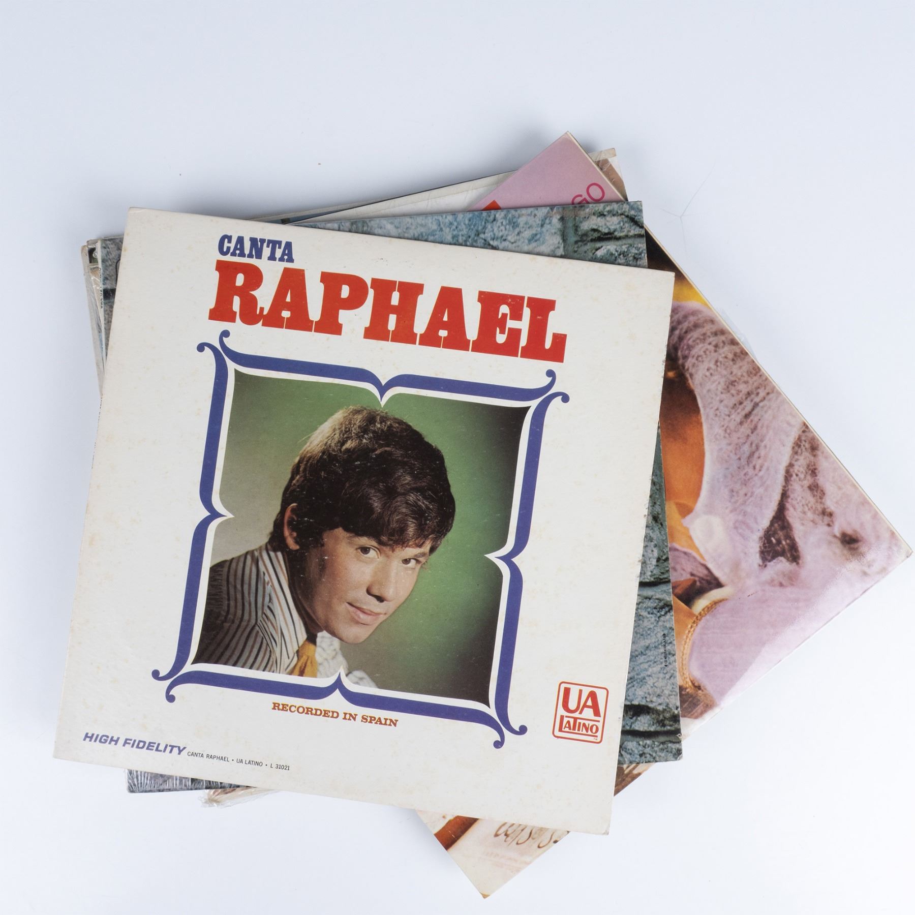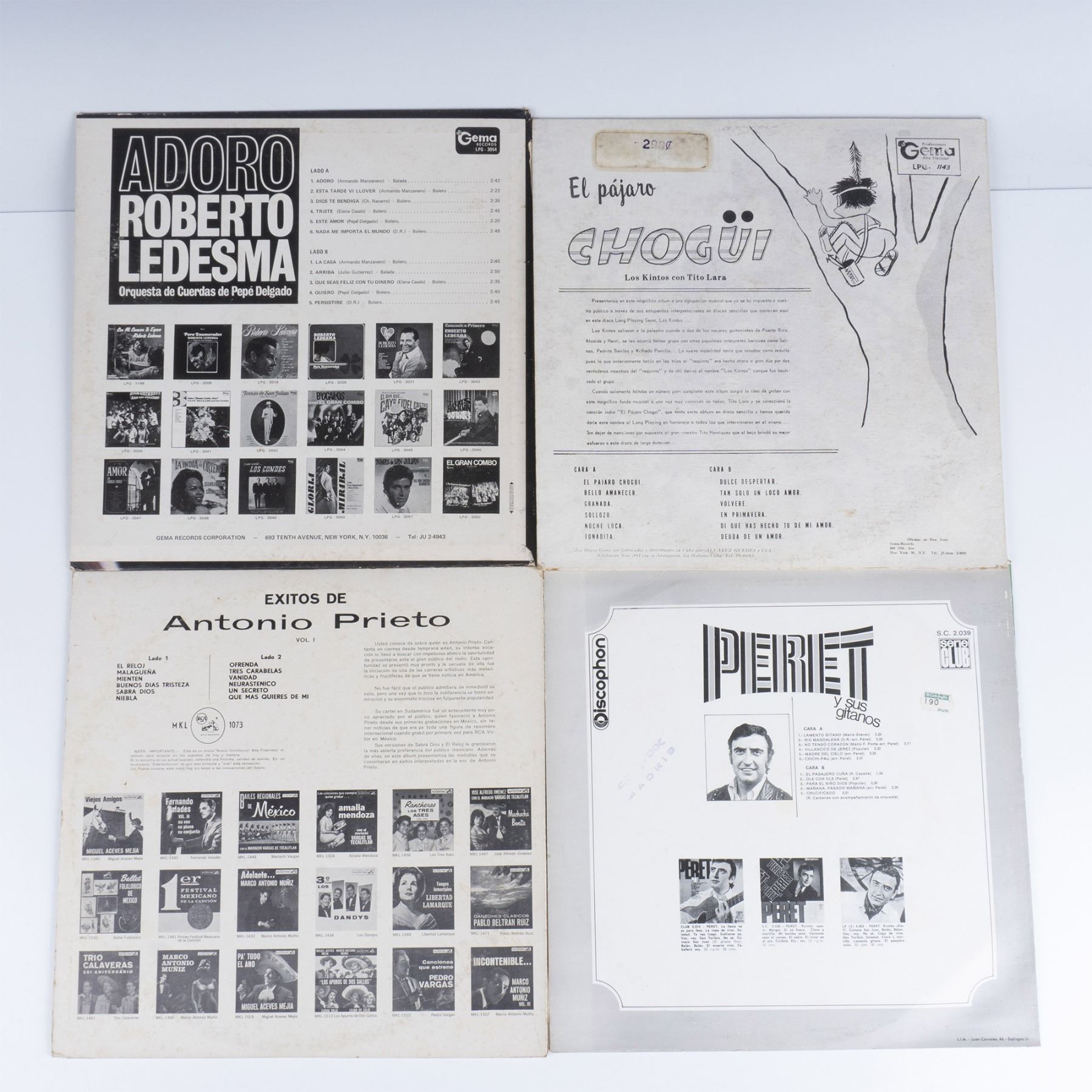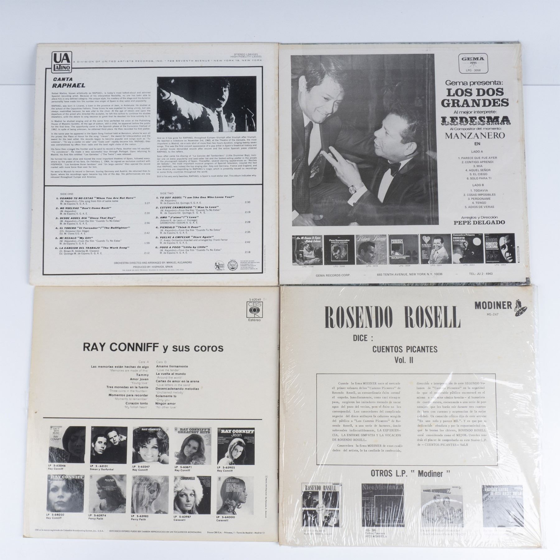 Includes High Fidelity by Canta Raphael, Los Dos Grandes by Roberto Ledesma, Las Memorias Estan Hechas De Algo by Ray Conniff y sus coros, Cuentos Picante by Rosendo Rosell, Adoro by Roberto Ledsma, El Pajaro Chogui by Los Kintos Con Tito Lara, Exitos de Antonio Prieto, and Peret y sus gatinos.
