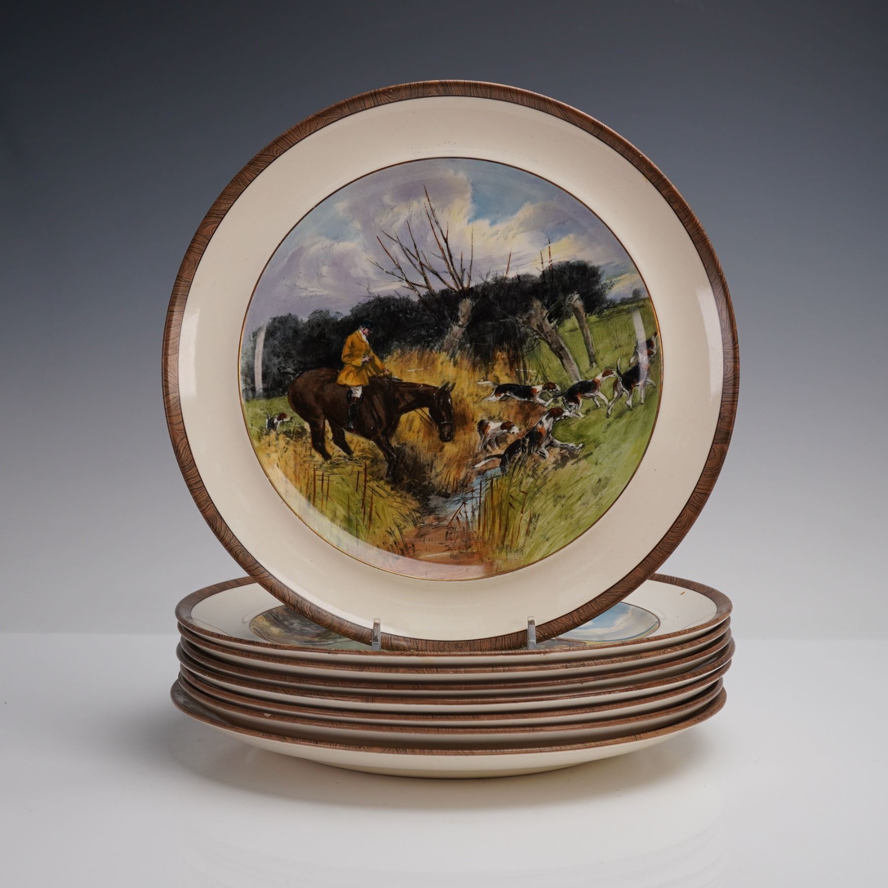 Specially designed for Soane & Smith Ltd. Each plate features a vividly hand-colored hunting scene from Edwards' series, including "A Check" (No. 4), "Going to Halloa" (No. 3), "Homeward" (No. 7), "The Kill" (No. 11), "The Last Draw" (No. 12), "Drawing the Dingle" (No. 10), and "Stag at Bay" (No. 9). The reverse of each plate bears the printed back stamp with registration number 691240 and attribution to Lionel Edwards. These plates bring together fine English ceramic craftsmanship and the artistry of one of Britain's most celebrated illustrators of the hunt.