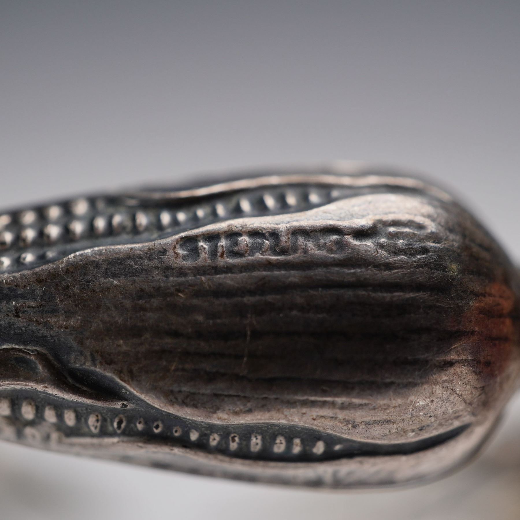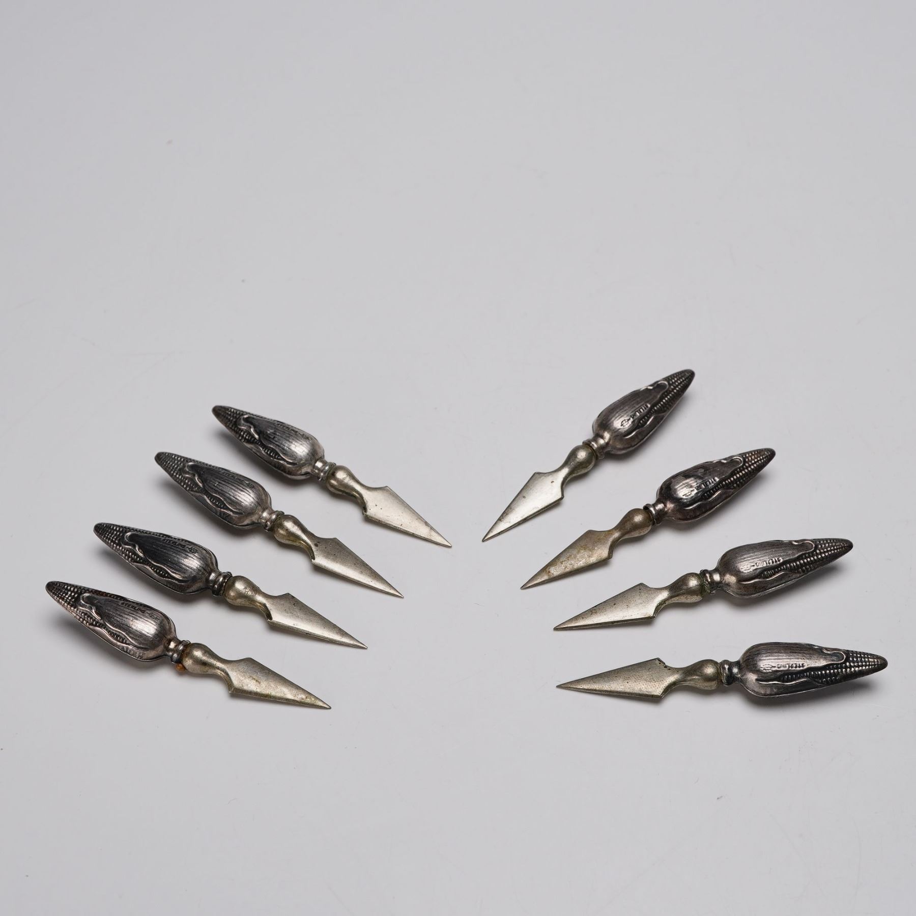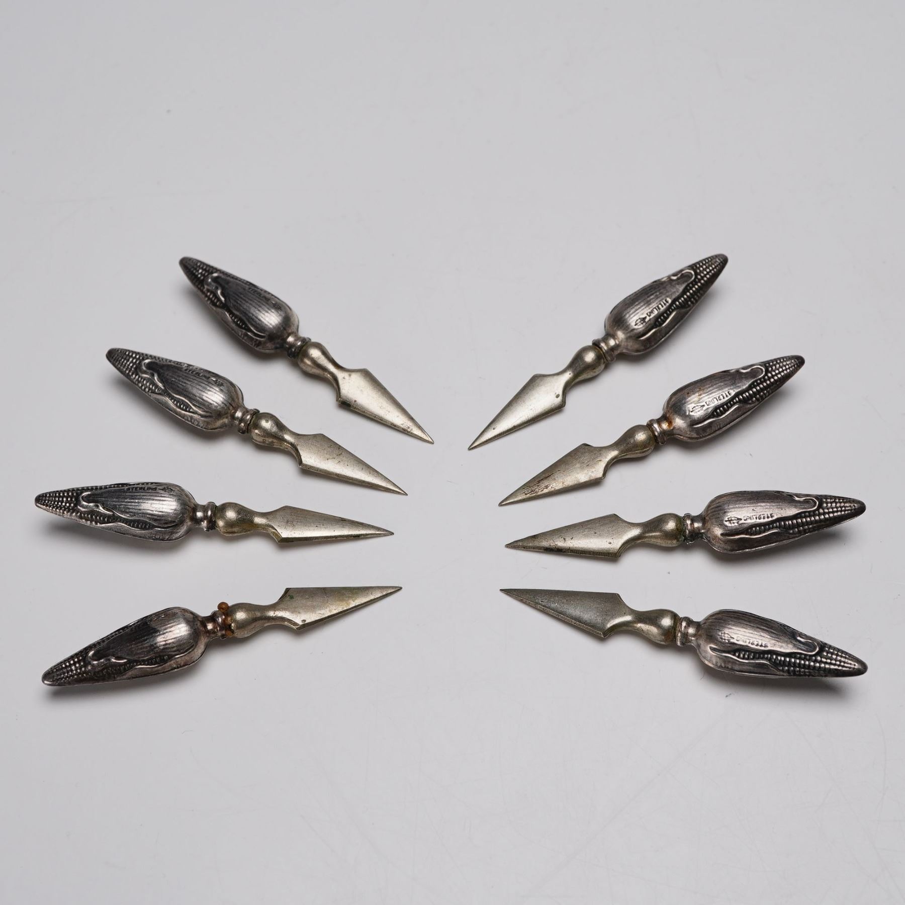 A set of eight sterling silver corn holders featuring handles shaped as detailed ears of corn. Each piece displays fine texture and craftsmanship, combining form and function with a polished finish and pointed prongs for secure use. A distinctive and decorative dining accessory. Marked Sterling. Webster Co. backstamp. Net weight: 86 g.