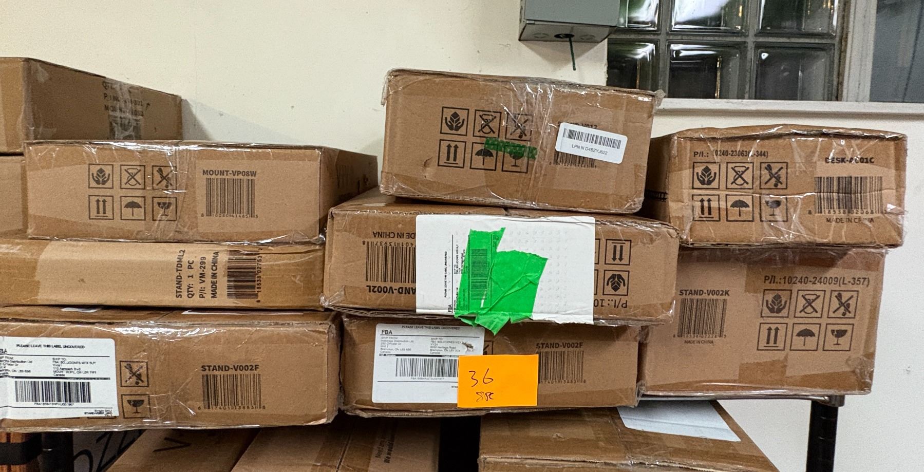 8pc assorted VIVO monitor mounts & items - pneumatic dual desk monitor mounts, wall monitor extra tall desk mount, white extending ceiling projector mount etc. (refurbished in boxes)
