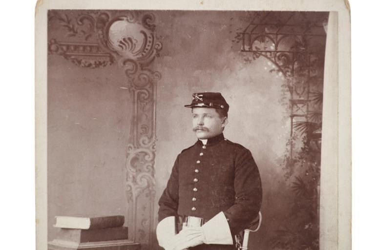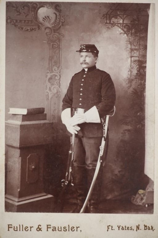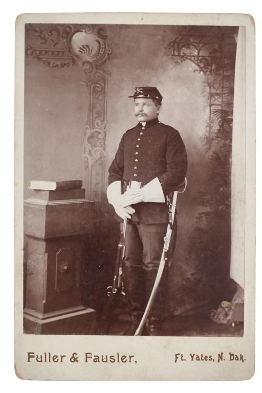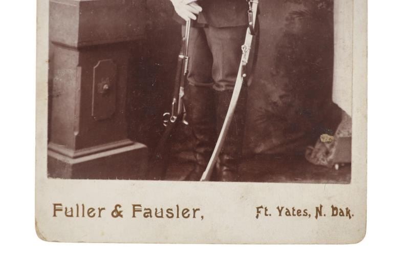 Featured in this lot is this original Fuller & Fansler cabinet card photo of a man in his U.S. 8th Cavalry Indian Wars uniform circa 1890's, from the ex-collection of the C.M. Russell Museum and John Kleinschmidt. John Henry and Jemima Parsons Fansler of Leadmine, West Virginia, gave birth to Stephen Truman Fansler on December 4, 1866. He had five brothers and two sisters. Fansler was a teacher who attended the Missouri School of Business in Cincinnati, Ohio, before entering the 8th Cavalry on October 18, 1890. He was a sharpshooter assigned to Fort Yates, a military installation on the Standing Rock Indian Reservation, which lies on the boundary of North and South Dakota. Following his honorable discharge in 1892, he became the post photographer and established a studio with Clarence Fuller, another local photographer. In addition to photos of post officials and soldiers, Fansler photographed the Dakotah Sioux and other local American Indians. During this period, Fansler hired a young apprentice called Frank Bennett Fiske. Fiske, the post's civilian wagon master's son, had developed an interest in photography and American Indian culture from an early age. Fansler, in a sense, helped Fiske develop his emerging photography skills by teaching him typical techniques of the day, such as glass-plate negatives and solar printing procedures. This photo shows a soldier in his uniform as he holds his rifle in his hand and wears his sword on his hip. His hat shows the 8th Cavalry insignia along with the letter "G" showing he was in G Company. The cabinet card reads, "Fuller & Fansler, Ft. Yates, N. Dak.". It shows good condition overall with slight wear present from its age and handling over the years, but no signs of major damage is noted. The cabinet card photo measures 6 1/2" L x 4 1/4" W.