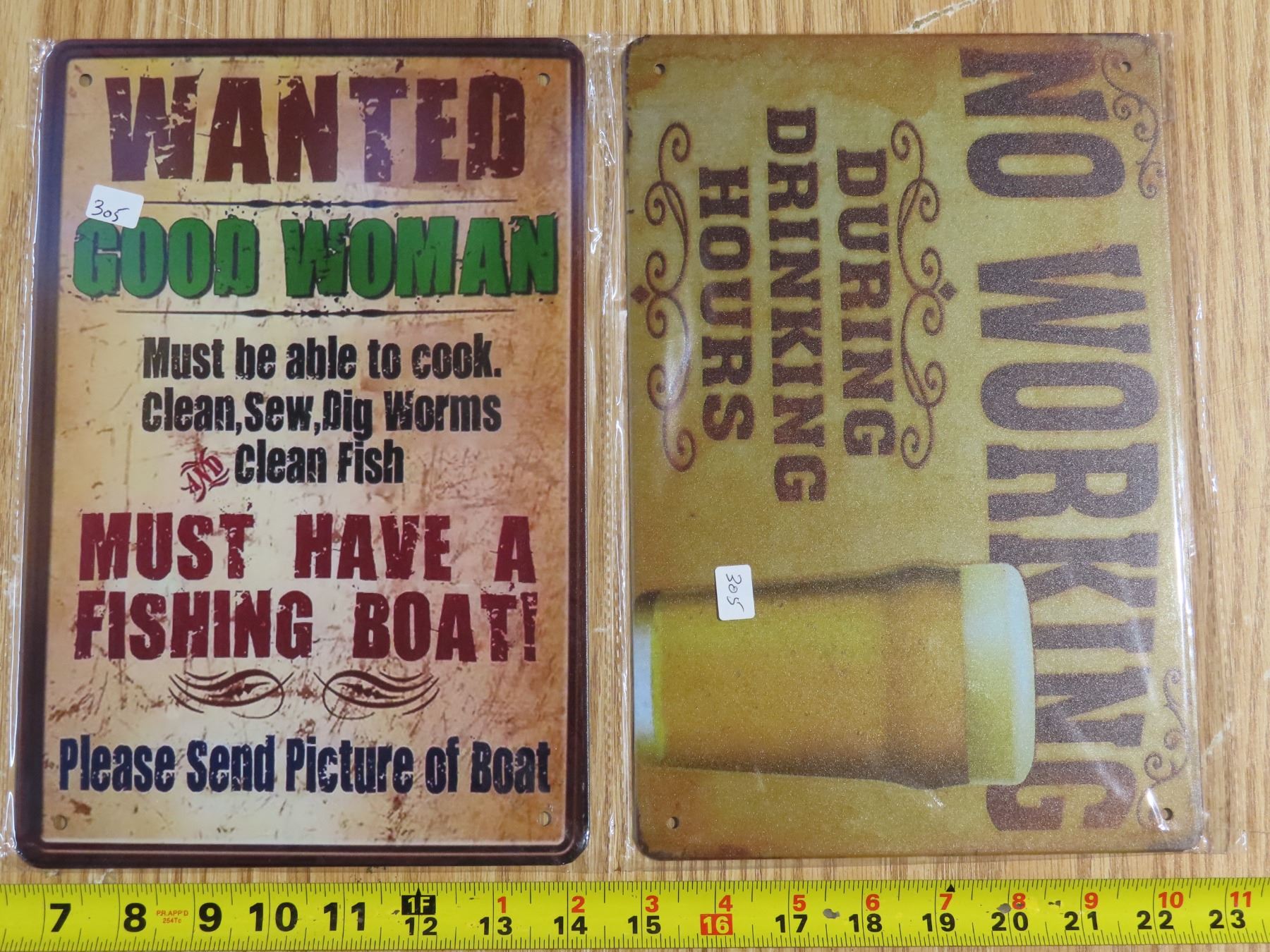 8x11" Tin Sign - " No working during drinking hours" and "Good woman wanted"