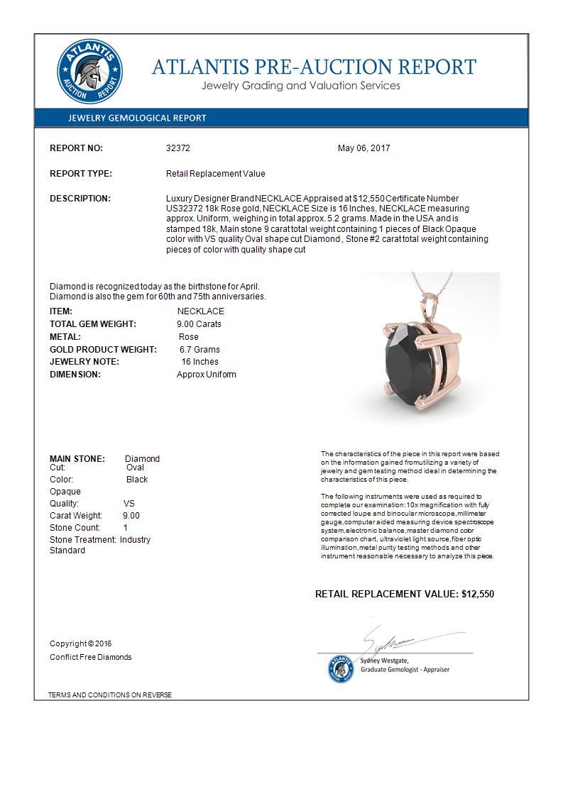 9.0 CTW Oval Black Diamond Designer Necklace 18K Rose Gold ---- Luxury Designer Brand NECKLACE Appraised Retail Price at $12,550 ---- SKU Number US32372 18k Rose gold NECKLACE Size is 16 Inches, NECKLACE measuring approx. Uniform, weighing in total approx. 5.2 grams. Made in the USA and is stamped 18k, Main stone 9.00 carat total weight containing 1 pieces of Black Opaque color with VS quality Oval shape cut Diamond , Stone #2 carat total weight containing pieces of color with quality shape cut