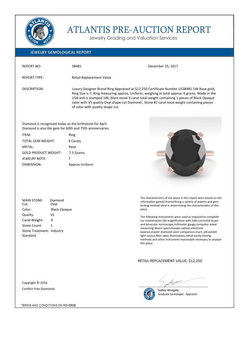 REF-202T5M -38481 ---- 9.0 CTW Oval Black Diamond Engagement Designer Ring 14K Rose Gold ---- Luxury Designer Brand Ring Appraised at $12,250 Certificate Number US38481 14k Rose gold, Ring Size is 7, Ring measuring approx. Uniform, weighing in total approx. 6 grams. Made in the USA and is stamped 14k, Main stone 9 carat total weight containing 1 pieces of Black Opaque color with VS quality Oval shape cut Diamond , Stone #2 carat total weight containing pieces of color with quality shape cut