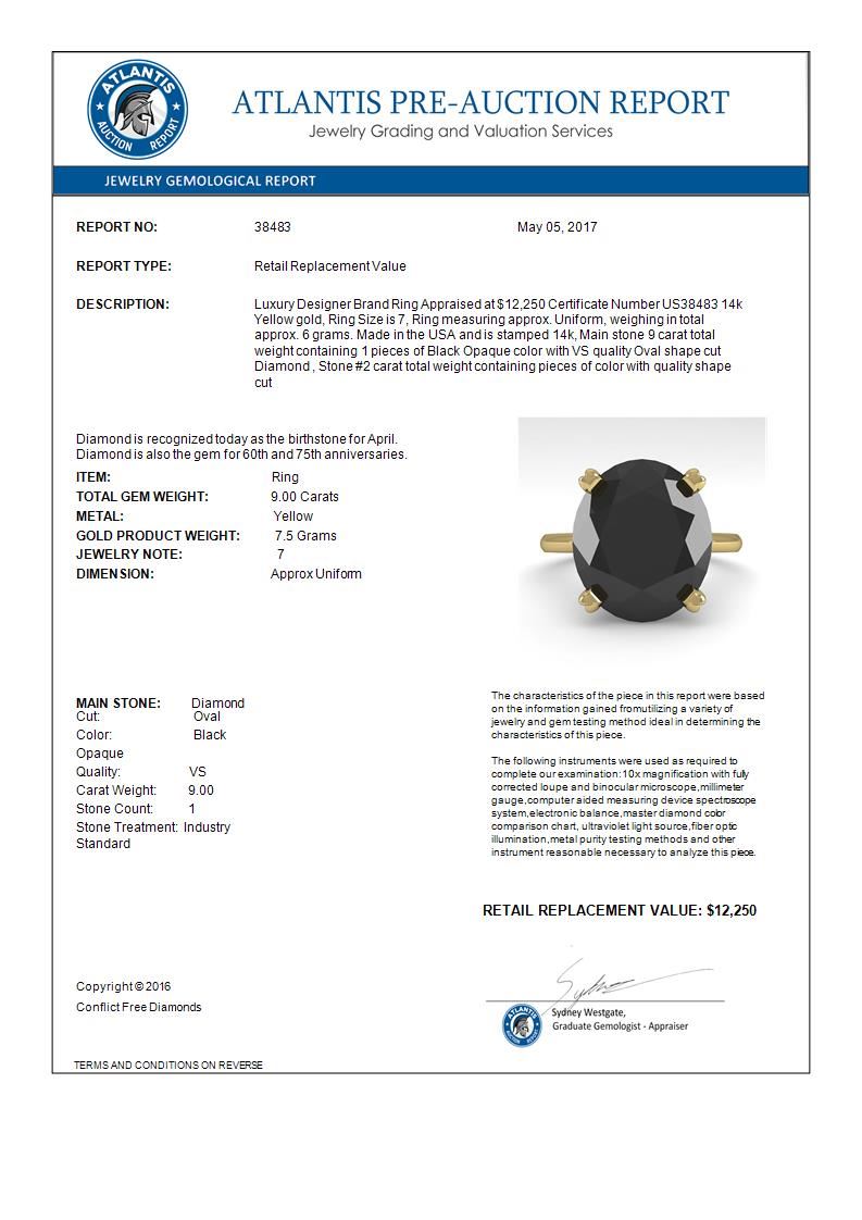 9.0 CTW Oval Black Diamond Engagement Designer Ring 14K Yellow Gold ---- Luxury Designer Brand Ring Appraised Retail Price at $12,250 ---- SKU Number US38483 14k Yellow gold Ring Size is 7, Ring measuring approx. Uniform, weighing in total approx. 6 grams. Made in the USA and is stamped 14k, Main stone 9.00 carat total weight containing 1 pieces of Black Opaque color with VS quality Oval shape cut Diamond , Stone #2 carat total weight containing pieces of color with quality shape cut