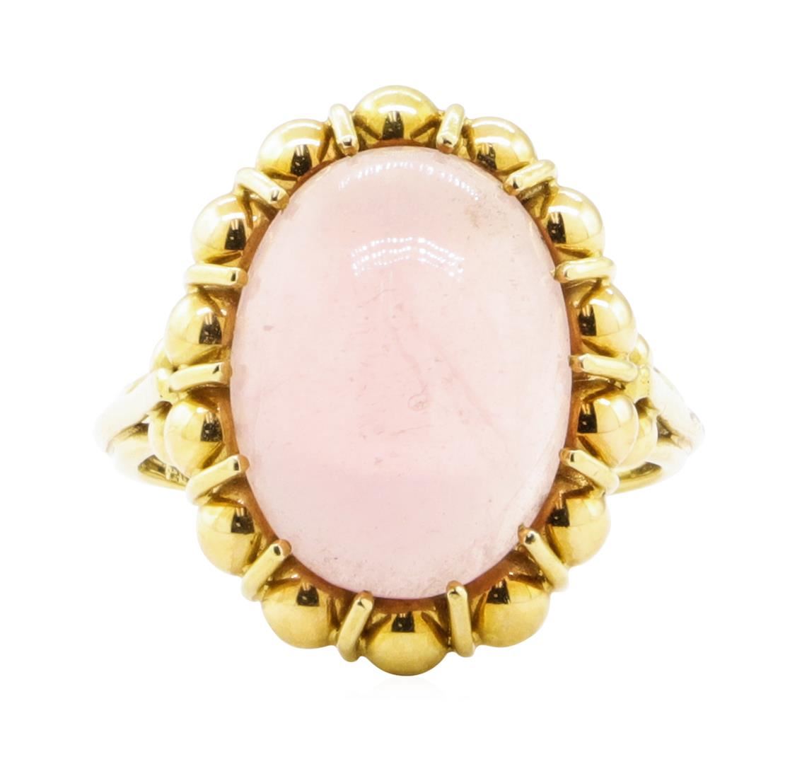 One handmade ring featuring: 18KT yellow gold weighing 7.7 grams containing one oval cabochon rose quartz weighing 9.00ct.