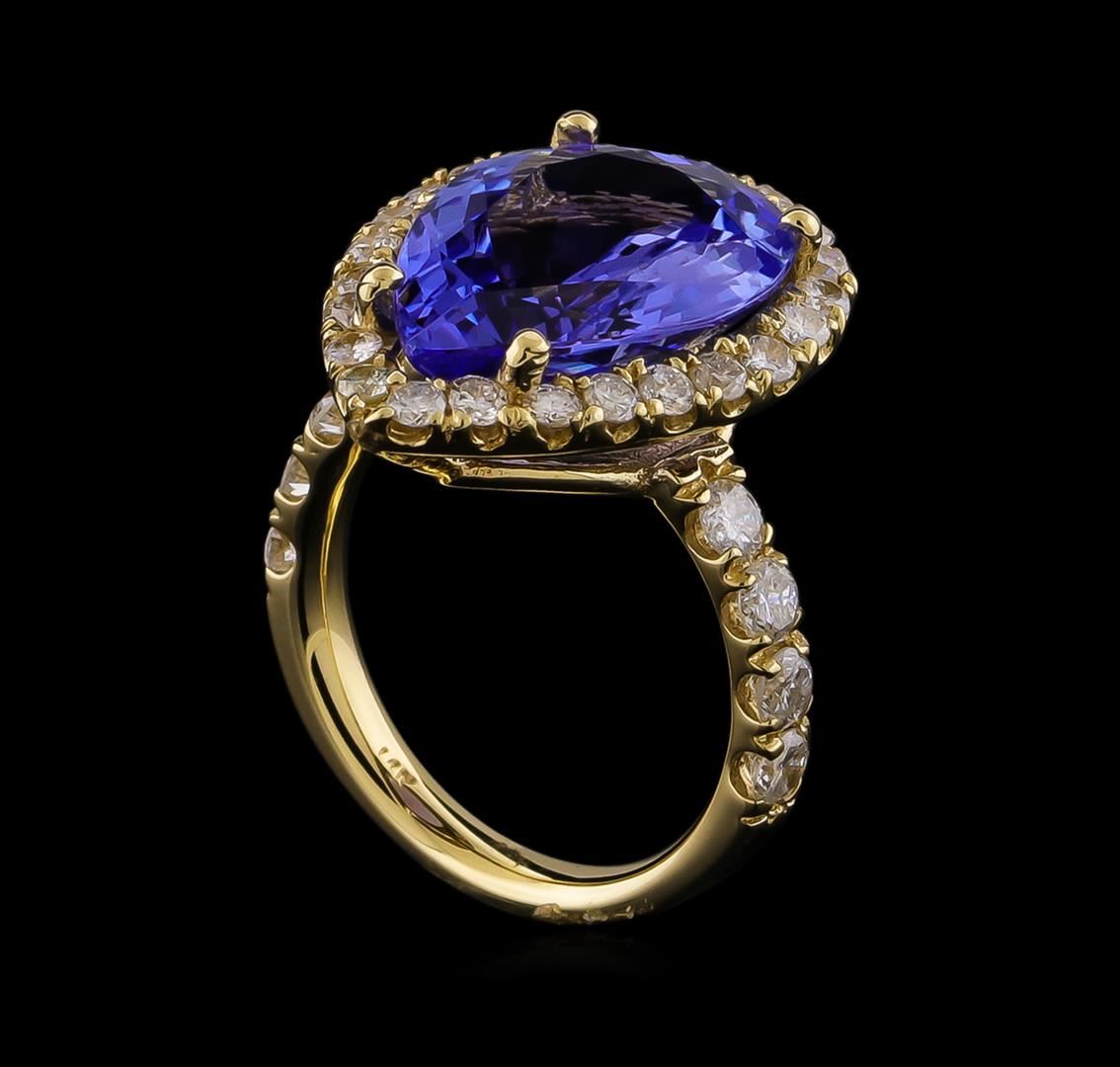 One electronically tested 14KT yellow gold lady's cast fashion ring with a cathedral halo with a bright polish finish. The featured lady's ring has a shank measuring 3.10 millimeters wide. Identified with markings of "14K". Condition is new, good workmanship. Containing: One prong set pear modified brilliant cut natural tanzanite, measuring 17.54 x 12.40 x 6.07mm, approximate weight of 9.00ct., clarity is eye clean, medium, moderately strong, violetish blue color, (GIA vB 5/4), cut is very good. Transmitting light with no distortion, transparent. Colored gemstones are presumed to have been subjected to commonly used enhancement processes. Graded in the setting. Twenty-Four prong set round brilliant cut diamonds, measuring 2.00 - 1.95 x 1.23mm (depth est.) approximate total weight of 24 Stones = 0.72ct. Graded in the setting. Clarity: SI-1 to I-1. Color: H - I. Cut Good Eight prong set round brilliant cut diamonds, measuring 3.00 - 2.95 x 1.85mm (depth est.) approximate total weight of 8 Stones = 0.80ct. Graded in the setting. Clarity: SI-2 to I-1. Color: G - Good. Total Weight of Colored Stones 9.00ct. Total Weight of Diamonds 1.52ct. Total Weight of Ring 8.60gm. GAS Appraised at $18,755.00.