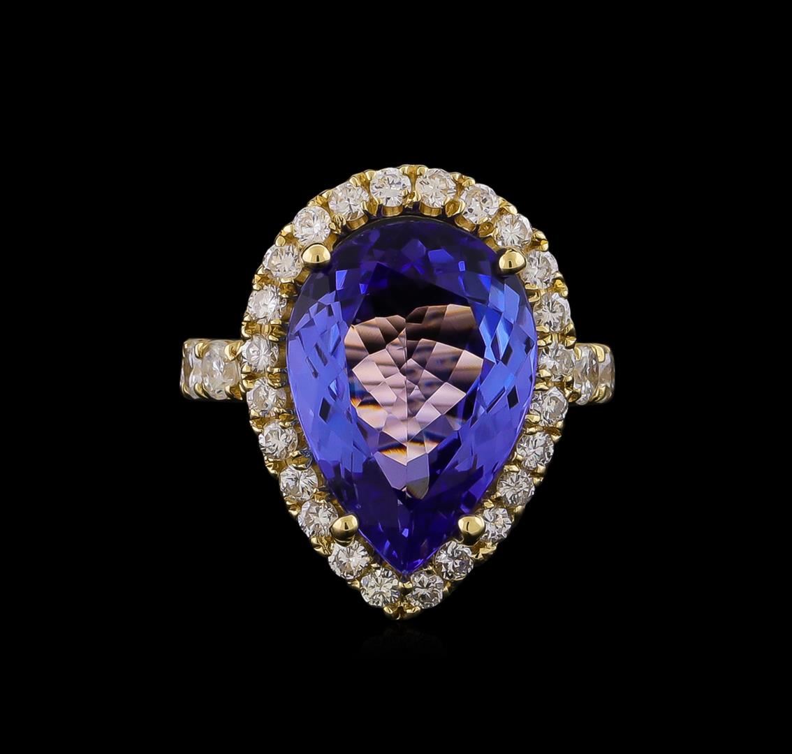 One electronically tested 14KT yellow gold lady's cast fashion ring with a cathedral halo with a bright polish finish. The featured lady's ring has a shank measuring 3.10 millimeters wide. Identified with markings of "14K". Condition is new, good workmanship. Containing: One prong set pear modified brilliant cut natural tanzanite, measuring 17.54 x 12.40 x 6.07mm, approximate weight of 9.00ct., clarity is eye clean, medium, moderately strong, violetish blue color, (GIA vB 5/4), cut is very good. Transmitting light with no distortion, transparent. Colored gemstones are presumed to have been subjected to commonly used enhancement processes. Graded in the setting. Twenty-Four prong set round brilliant cut diamonds, measuring 2.00 - 1.95 x 1.23mm (depth est.) approximate total weight of 24 Stones = 0.72ct. Graded in the setting. Clarity: SI-1 to I-1. Color: H - I. Cut Good Eight prong set round brilliant cut diamonds, measuring 3.00 - 2.95 x 1.85mm (depth est.) approximate total weight of 8 Stones = 0.80ct. Graded in the setting. Clarity: SI-2 to I-1. Color: G - Good. Total Weight of Colored Stones 9.00ct. Total Weight of Diamonds 1.52ct. Total Weight of Ring 8.60gm. GAS Appraised at $18,755.00.