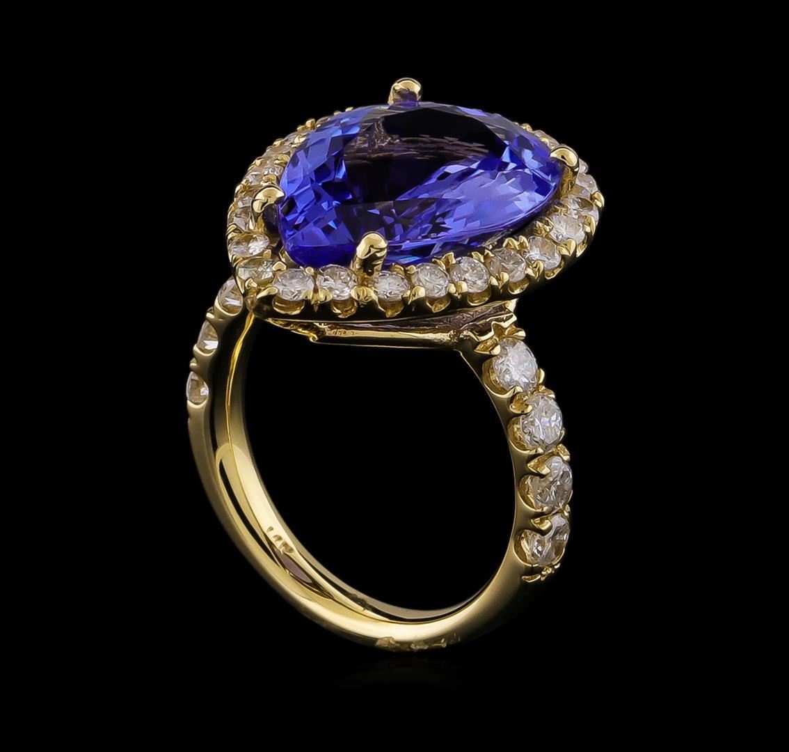 One electronically tested 14KT yellow gold lady's cast fashion ring with a cathedral halo with a bright polish finish. The featured lady's ring has a shank measuring 3.10 millimeters wide. Identified with markings of "14K". Condition is new, good workmanship. Containing: One prong set pear modified brilliant cut natural tanzanite, measuring 17.54 x 12.40 x 6.07mm, approximate weight of 9.00 ct., clarity is eye clean, medium, moderately strong, violetish blue color, (GIA vB 5/4), cut is very good. Transmitting light with no distortion, transparent. Colored gemstones are presumed to have been subjected to commonly used enhancement processes. Graded in the setting. Twenty-Four prong set round brilliant cut diamonds, measuring 2.00 - 1.95 x 1.23mm (depth est.) approximate total weight of 24 Stones = 0.72ct. Graded in the setting. Clarity: SI-1 to I-1. Color: H - I. Cut Good Eight prong set round brilliant cut diamonds, measuring 3.00 - 2.95 x 1.85mm (depth est.) approximate total weight of 8 Stones = 0.80 ct. Graded in the setting. Clarity: SI-2 to I-1. Color: G - Good. Total Weight of Colored Stones 9.00 ct. Total Weight of Diamonds 1.52ct. Total Weight of Ring 8.60gm. GAS Appraised.