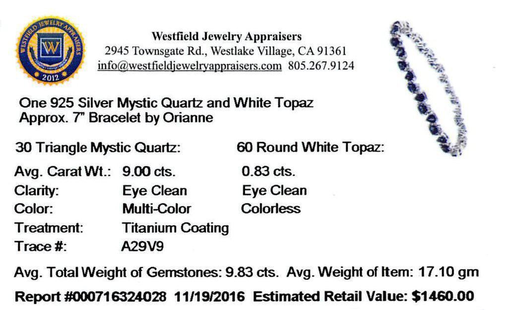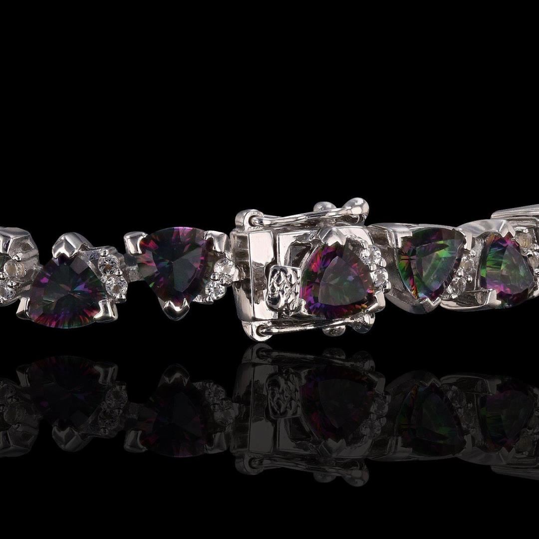 Electronically tested 925 silver ladies cast & assembled mystic quartz and white topaz bracelet. Seven inch length bracelet features a flexible mystic quartz and white topaz duo ribbon, terminating in a concealed clasp with twin safeties. Bright polish fi