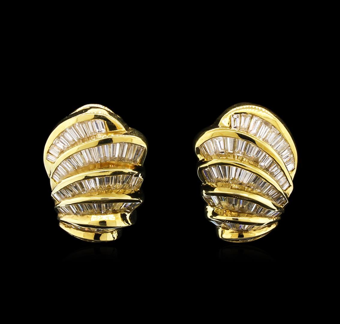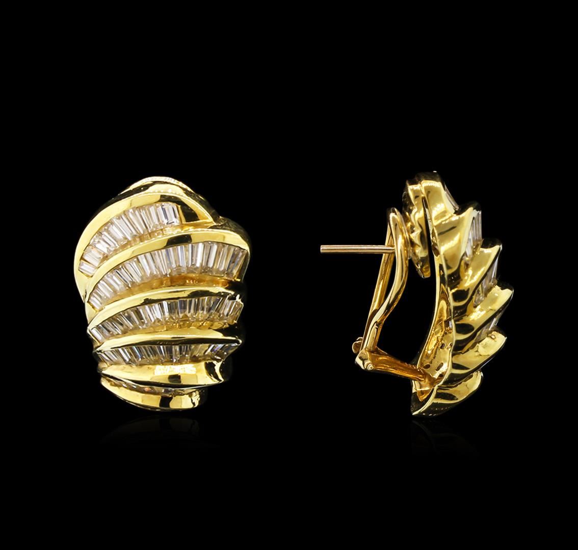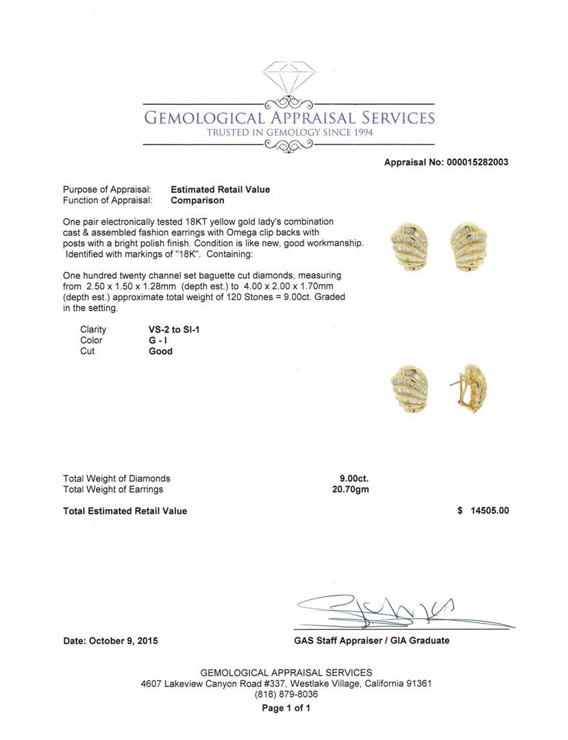 One pair electronically tested 18KT yellow gold lady's combination cast & assembled fashion earrings with Omega clip backs with posts with a bright polish finish. Identified with markings of "18K". Condition is like new, good workmanship. Containing: One Hundred Twenty channel set baguette cut diamonds, measuring from 2.50 x 1.50 x 1.28mm (depth est.) to 4.00 x 2.00 x 1.70mm (depth est.) approximate total weight of 120 Stones = 9.00ct. Graded in the setting. Clarity: VS-2 to SI-1. Color: G - I. Cut Good. Total Weight of Diamonds 9.00ct. Total Weight of Earrings 20.70gm. GAS Appraised at $14,505.00.