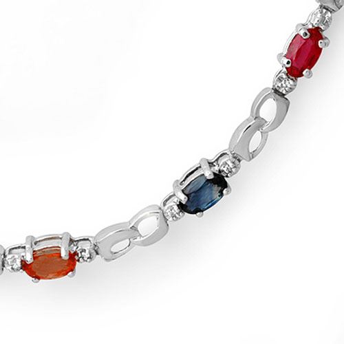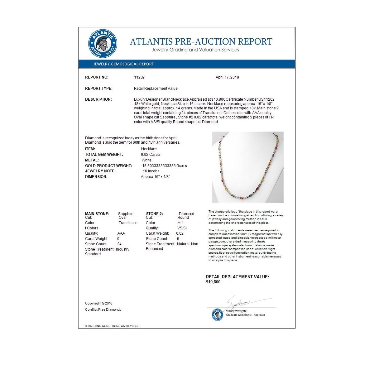REF-163K6W -11202 ---- 9.02 CTW Multi-Sapphire & Diamond Necklace 18K White Gold ---- Luxury Designer Brand Necklace Appraised at $10,800 Certificate Number US11202 18k White gold, Necklace Size is 16 Incehs, Necklace measuring approx. 16" x 1/8", weighing in total approx. 14 grams. Made in the USA and is stamped 18k, Main stone 9 carat total weight containing 24 pieces of Translucent Colors color with AAA quality Oval shape cut Sapphire , Stone #2 0.02 carat total weight containing 5 pieces of H-I color with VS/SI quality Round shape cut Diamond