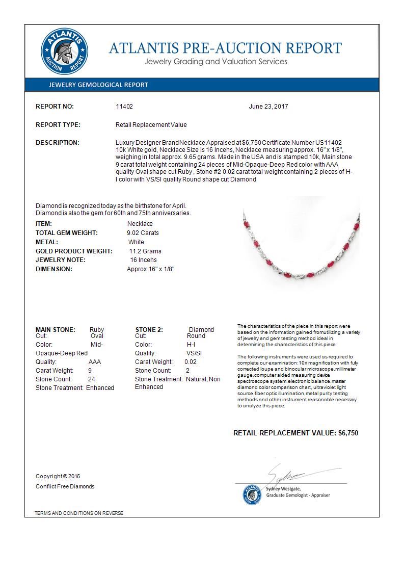 9.02 CTW Ruby & Diamond Necklace 10K White Gold ---- Luxury Designer Brand Necklace Appraised Retail Price at $6,750 ---- SKU Number US11402 10k White gold Necklace Size is 16 Incehs, Necklace measuring approx. 16" x 1/8", weighing in total approx. 9.65 grams. Made in the USA and is stamped 10k, Main stone 9 carat total weight containing 24 pieces of Mid-Opaque-Deep Red color with AAA quality Oval shape cut Ruby , Stone #2 0.02 carat total weight containing 2 pieces of H-I color with VS/SI quality Round shape cut