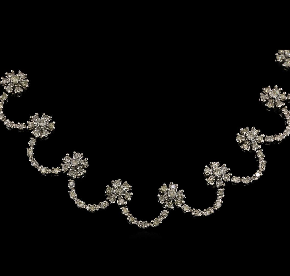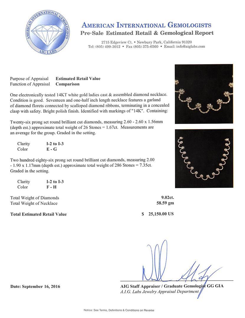 One electronically tested 14KT white gold ladies cast & assembled diamond necklace. Seventeen and one-half inch length necklace features a garland of diamond florets connected by scalloped diamond ribbons, terminating in a concealed clasp with safety. Bright polish finish. Identified with markings of '14K'. Condition is good. Containing: Twenty-Six prong set round brilliant cut diamonds, measuring 2.60 - 2.60 x 1.56mm (depth est.) approximate total weight of 26 Stones = 1.67ct. Measurements are an average for the group. Graded in the setting. Clarity I-2 to I-3. Color: E - G Two Hundred Eighty-Six prong set round brilliant cut diamonds, measuring 2.00 - 1.90 x 1.17mm (depth est.) approximate total weight of 286 Stones = 7.35ct. Graded in the setting. Clarity I-2 to I-3. Color: F - H. Total Weight of Diamonds 9.02ct.. Total Weight of Necklace 58.59gm. AIG Appraised at $25,150.00.