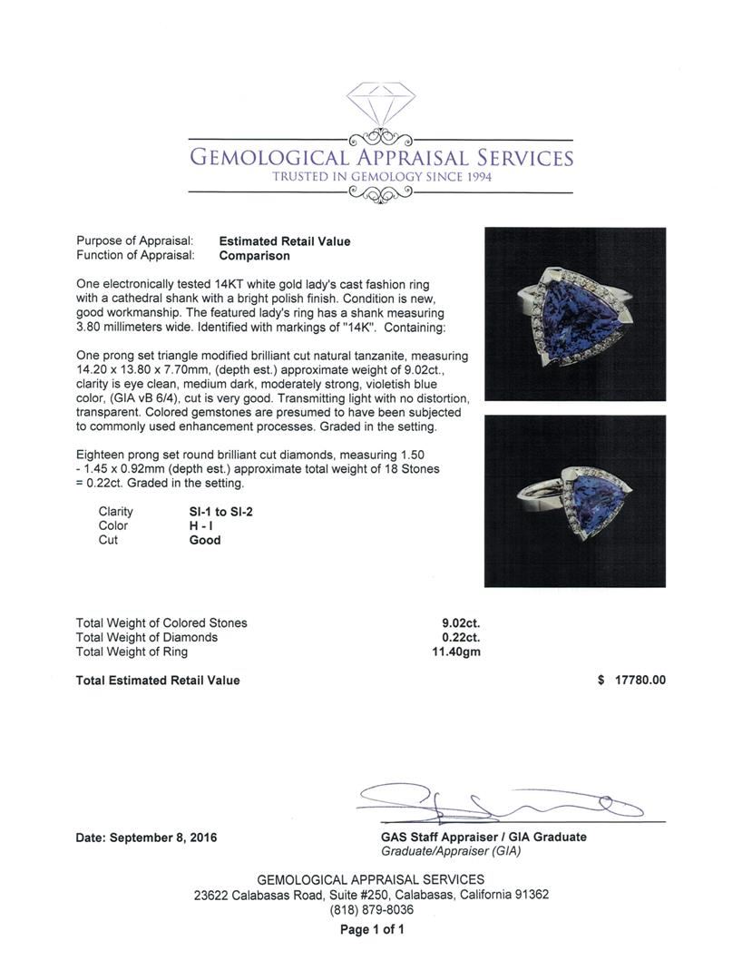 One electronically tested 14KT white gold lady's cast fashion ring with a cathedral shank with a bright polish finish. The featured lady's ring has a shank measuring 3.80 millimeters wide. Identified with markings of '14K'. Condition is new, good workmanship. Containing: One prong set triangle modified brilliant cut natural tanzanite, measuring 14.20 x 13.80 x 7.70mm, (depth est.) approximate weight of 9.02ct., clarity is eye clean, medium dark, moderately strong, violetish blue color, (GIA vB 6/4), cut is very good. Transmitting light with no distortion, transparent. Colored gemstones are presumed to have been subjected to commonly used enhancement processes. Graded in the setting. Eighteen prong set round brilliant cut diamonds, measuring 1.50 - 1.45 x 0.92mm (depth est.) approximate total weight of 18 Stones = 0.22ct. Graded in the setting. Clarity SI-1 to SI-2. Color: H - I Cut Good. Total Weight of Colored Stones 9.02ct.. Total Weight of Diamonds 0.22ct.. Total Weight of Ring 11.40gm GAS Appraised at $17,780.00.