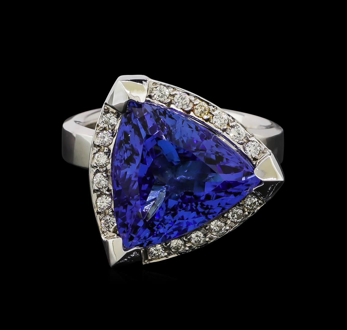 One electronically tested 14KT white gold lady's cast fashion ring with a cathedral shank with a bright polish finish. The featured lady's ring has a shank measuring 3.80 millimeters wide. Identified with markings of '14K'. Condition is new, good workmanship. Containing: One prong set triangle modified brilliant cut natural tanzanite, measuring 14.20 x 13.80 x 7.70mm, (depth est.) approximate weight of 9.02ct., clarity is eye clean, medium dark, moderately strong, violetish blue color, (GIA vB 6/4), cut is very good. Transmitting light with no distortion, transparent. Colored gemstones are presumed to have been subjected to commonly used enhancement processes. Graded in the setting. Eighteen prong set round brilliant cut diamonds, measuring 1.50 - 1.45 x 0.92mm (depth est.) approximate total weight of 18 Stones = 0.22ct. Graded in the setting. Clarity SI-1 to SI-2. Color: H - I Cut Good. Total Weight of Colored Stones 9.02ct.. Total Weight of Diamonds 0.22ct.. Total Weight of Ring 11.40gm GAS Appraised at $17,780.00.