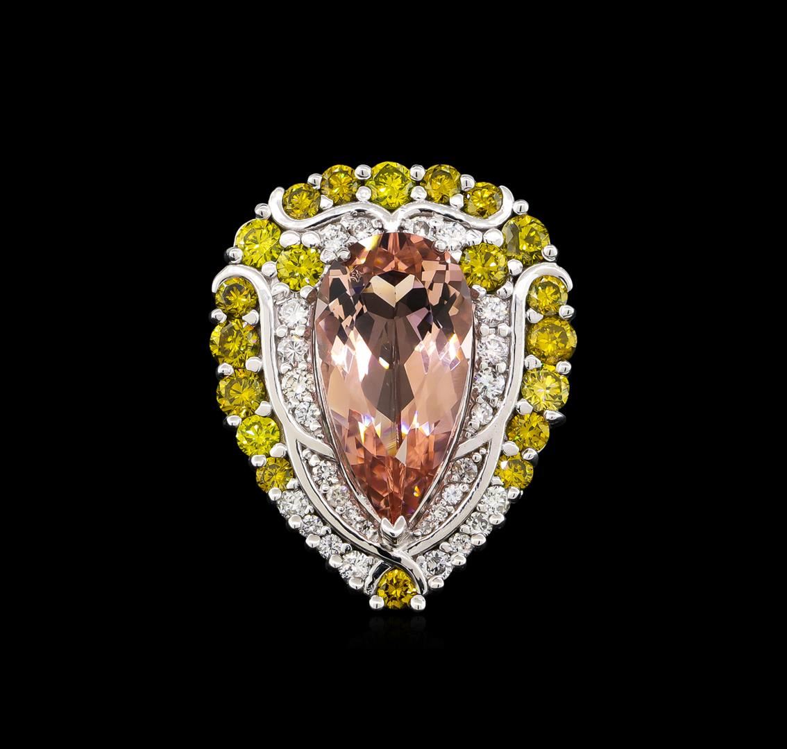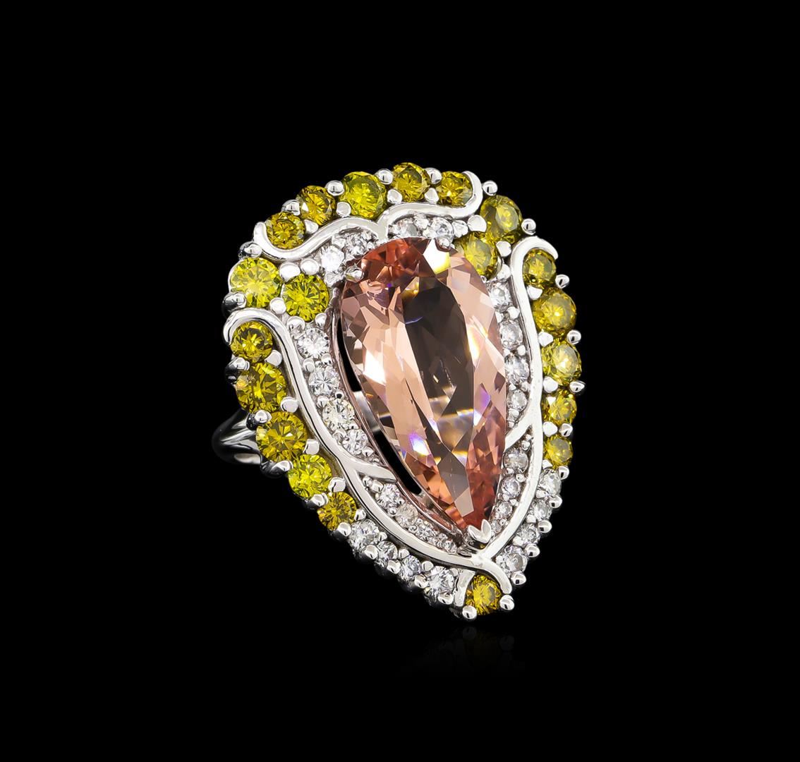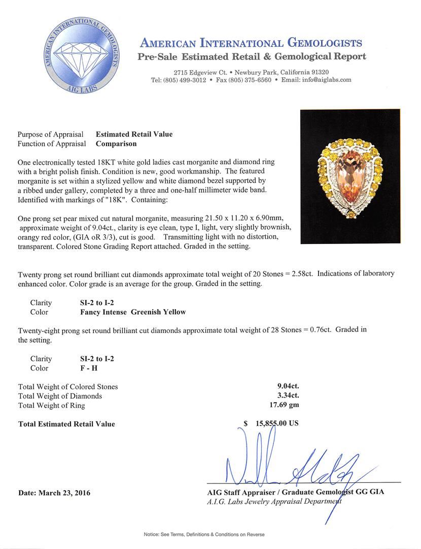 One electronically tested 18KT white gold ladies cast morganite and diamond ring with a bright polish finish. The featured morganite is set within a stylized yellow and white diamond bezel supported by a ribbed under gallery, completed by a three and one-half millimeter wide band. Identified with markings of "18K". Condition is new, good workmanship. Containing: One prong set pear mixed cut natural morganite, measuring 21.50 x 11.20 x 6.90mm, approximate weight of 9.04ct., clarity is eye clean, type I, light, very slightly brownish, orangy red color, (GIA oR 3/3), cut is good. Transmitting light with no distortion, transparent. Colored Stone Grading Report attached. Graded in the setting. Twenty prong set round brilliant cut diamonds approximate total weight of 20 Stones = 2.58ct. Indications of laboratory enhanced color. Color grade is an average for the group. Graded in the setting. Clarity: SI-2 to I-2 Twenty-Eight prong set round brilliant cut diamonds approximate total weight of 28 Stones = 0.76ct. Graded in the setting. Clarity: SI-2 to I-2. Color: F - H. Total Weight of Colored Stones 9.04ct. Total Weight of Diamonds 3.34ct. Total Weight of Ring 17.69gm. AIG Appraised at $15,855.00.