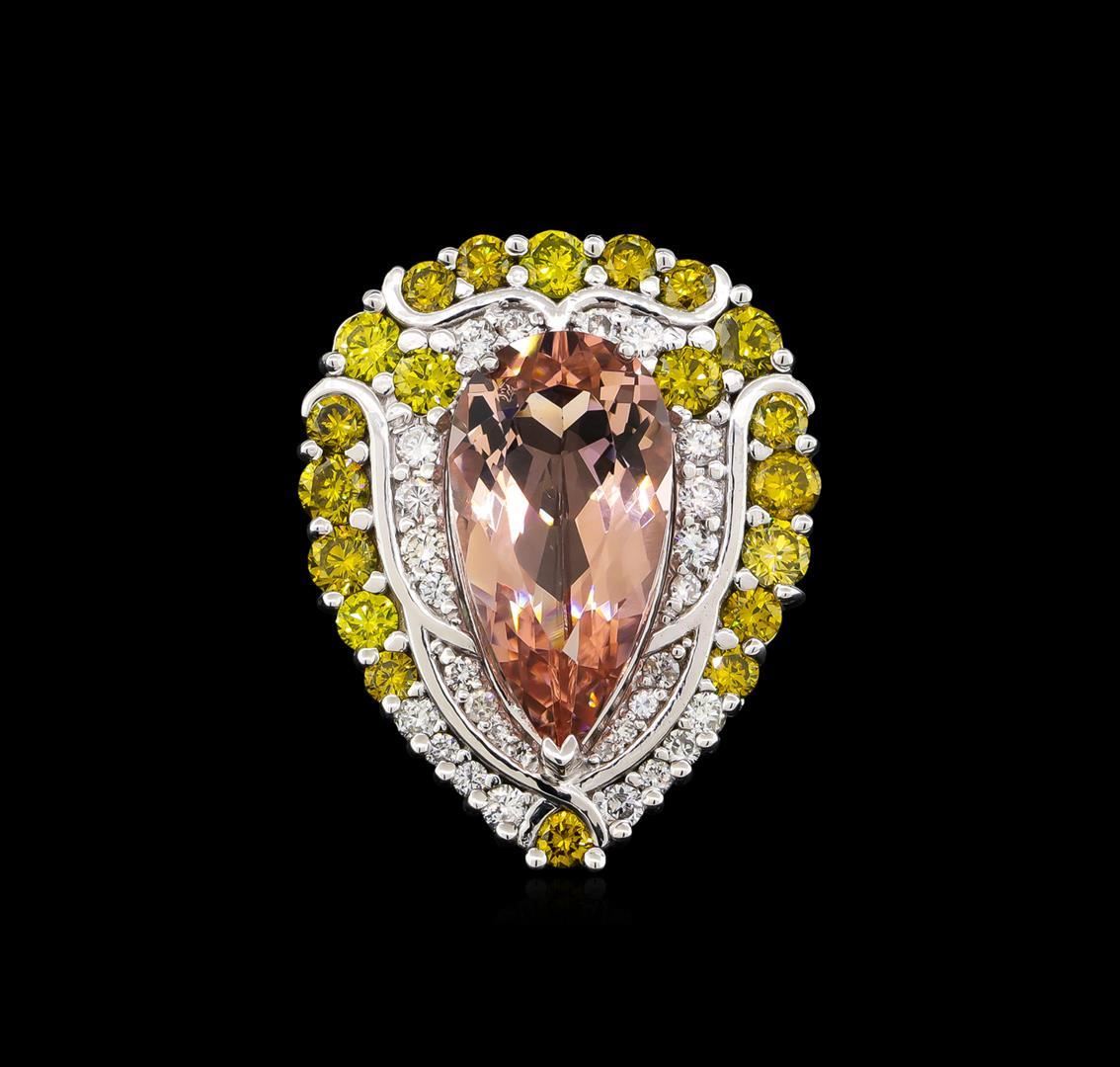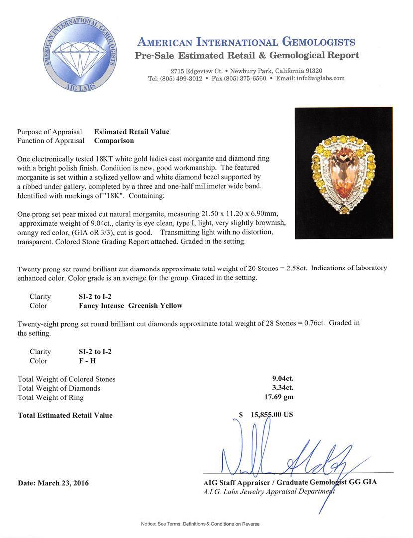 One electronically tested 18KT white gold ladies cast morganite and diamond ring with a bright polish finish. The featured morganite is set within a stylized yellow and white diamond bezel supported by a ribbed under gallery, completed by a three and one-half millimeter wide band. Identified with markings of "18K". Condition is new, good workmanship. Containing: One prong set pear mixed cut natural morganite, measuring 21.50 x 11.20 x 6.90mm, approximate weight of 9.04ct., clarity is eye clean, type I, light, very slightly brownish, orangy red color, (GIA oR 3/3), cut is good. Transmitting light with no distortion, transparent. Colored Stone Grading Report attached. Graded in the setting. Twenty prong set round brilliant cut diamonds approximate total weight of 20 Stones = 2.58ct. Indications of laboratory enhanced color. Color grade is an average for the group. Graded in the setting. Clarity: SI-2 to I-2 Twenty-Eight prong set round brilliant cut diamonds approximate total weight of 28 Stones = 0.76ct. Graded in the setting. Clarity: SI-2 to I-2. Color: F - H. Total Weight of Colored Stones 9.04ct. Total Weight of Diamonds 3.34ct. Total Weight of Ring 17.69gm. AIG Appraised.