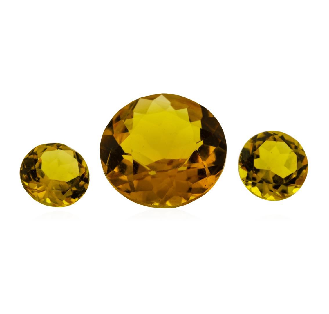 One natural round cut citrine quartz parcel of three with an exact weight of 9.04ctw., clarity is eye clean, yellowish orange, medium dark to medium. Gemological Appraisals Services estimates the retail value at $361.6 GAS Appraised.