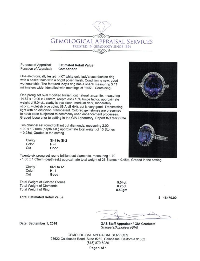 One electronically tested 14KT white gold lady's cast fashion ring with a basket halo with a bright polish finish. The featured lady's ring has a shank measuring 3.11 millimeters wide. Identified with markings of '14K'. Condition is new, good workmanship. Containing: One prong set oval modified brilliant cut natural tanzanite, measuring 14.67 x 10.06 x 7.69mm, (depth est.) 13%. bulge factor, approximate weight of 9.04ct., clarity is eye clean, medium dark, moderately strong, violetish blue color, (GIA vB 6/4), cut is very good. Transmitting light with no distortion, transparent. Colored gemstones are presumed to have been subjected to commonly used enhancement processes. Graded loose prior to setting in the GIA Laboratory, Report #2175665834. Ten channel set round brilliant cut diamonds, measuring 2.00 - 1.90 x 1.21mm (depth est.) approximate total weight of 10 Stones = 0.28ct. Graded in the setting. Clarity SI-1 to SI-2. Color: H - I Cut Good Twenty-Six prong set round brilliant cut diamonds, measuring 1.70 - 1.60 x 1.03mm (depth est.) approximate total weight of 26 Stones = 0.45ct. Graded in the setting. Clarity SI-1 to I-1. Color: H - I Cut Good. Total Weight of Colored Stones 9.04ct.. Total Weight of Diamonds 0.73ct.. Total Weight of Ring 8.50gm GAS Appraised at $18,470.00.