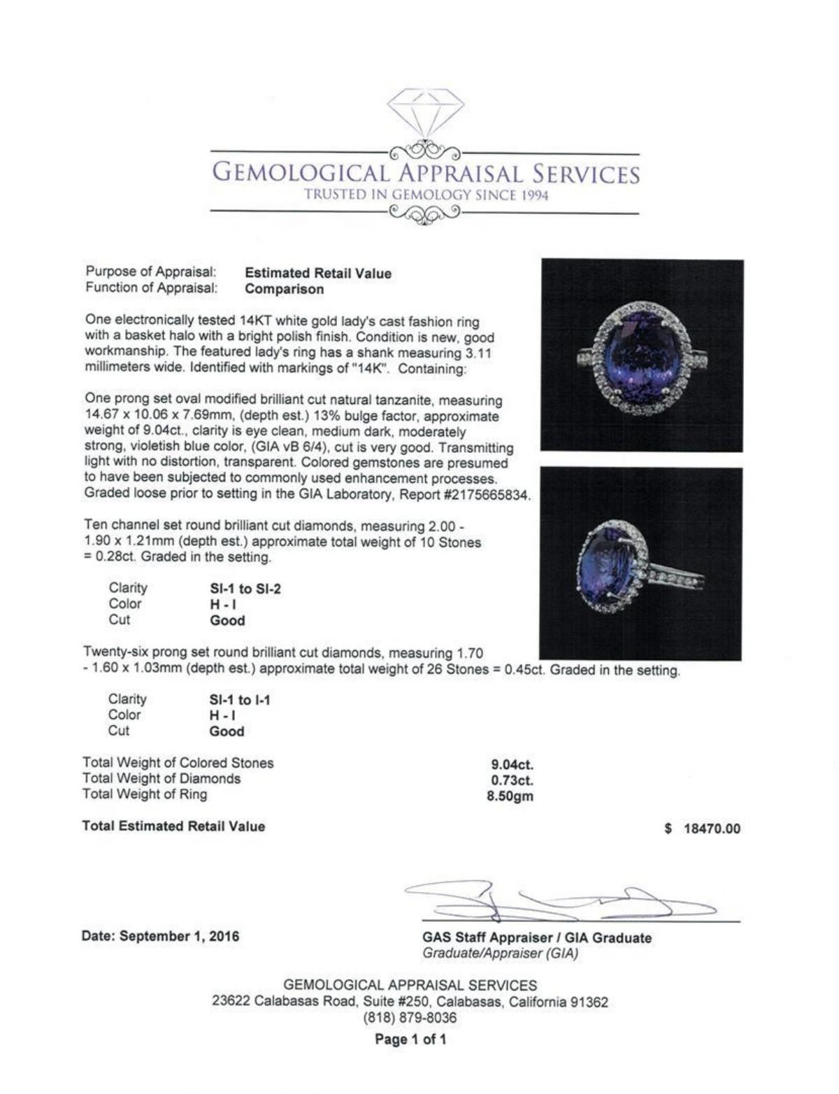 One electronically tested 14KT white gold lady's cast fashion ring with a basket halo with a bright polish finish. The featured lady's ring has a shank measuring 3.11 millimeters wide. Identified with markings of '14K'. Condition is new, good workmanship. Containing: One prong set oval modified brilliant cut natural tanzanite, measuring 14.67 x 10.06 x 7.69mm, (depth est.) 13%. bulge factor, approximate weight of 9.04ct., clarity is eye clean, medium dark, moderately strong, violetish blue color, (GIA vB 6/4), cut is very good. Transmitting light with no distortion, transparent. Colored gemstones are presumed to have been subjected to commonly used enhancement processes. Graded loose prior to setting in the GIA Laboratory, Report #2175665834. Ten channel set round brilliant cut diamonds, measuring 2.00 - 1.90 x 1.21mm (depth est.) approximate total weight of 10 Stones = 0.28ct. Graded in the setting. Clarity SI-1 to SI-2. Color: H - I Cut Good Twenty-Six prong set round brilliant cut diamonds, measuring 1.70 - 1.60 x 1.03mm (depth est.) approximate total weight of 26 Stones = 0.45ct. Graded in the setting. Clarity SI-1 to I-1. Color: H - I Cut Good. Total Weight of Colored Stones 9.04ct.. Total Weight of Diamonds 0.73ct.. Total Weight of Ring 8.50gm GAS Appraised.