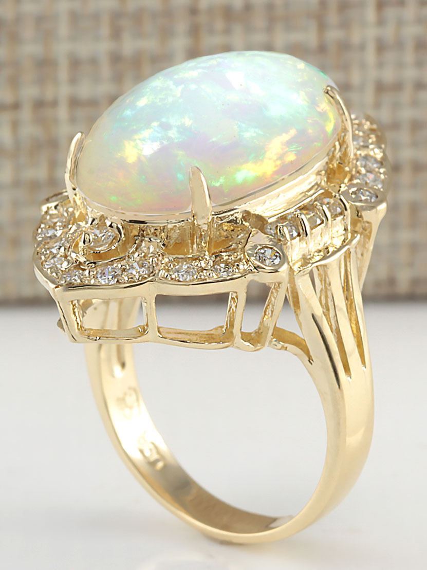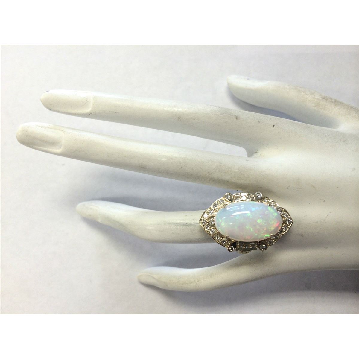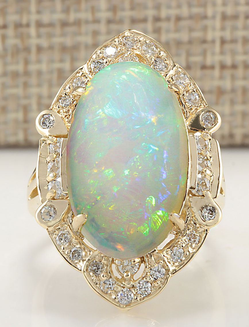 Stamped: 14K Ring Size: 7.25 Total Ring Weight: 10 Grams Diamond Weight: Total natural diamond weight is .80carat. SI1-SI2 clarity / G-H color Gemstone Weight: Total Natural Opal Weight is 8.25ctw (Measures: 20.18x12.40mm) Face Measures: 29.18x18.83mm SKU: [704233]