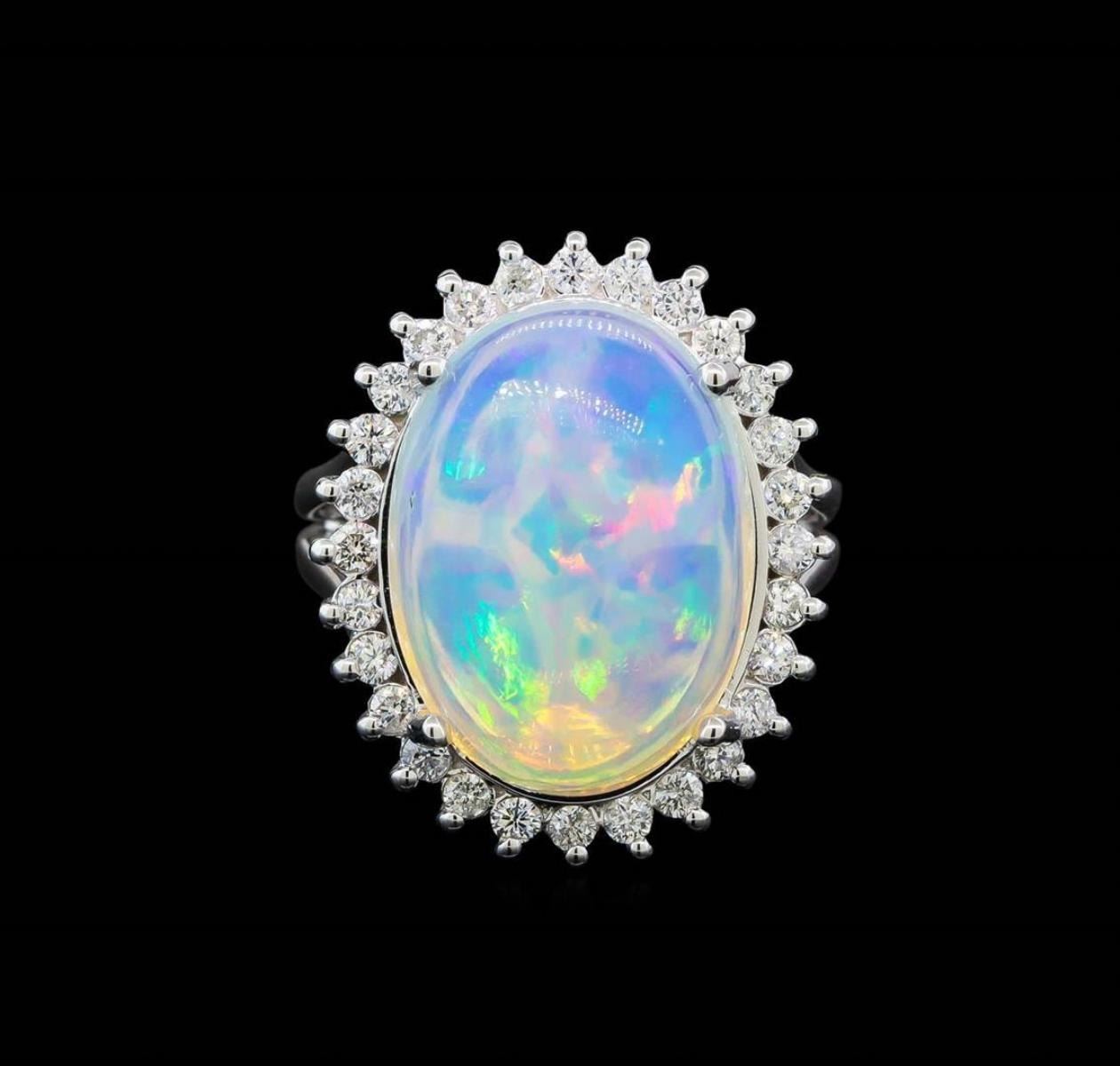 One electronically tested 14KT white gold lady's cast fashion ring with a split European shank with a halo with a bright polish finish. The featured lady's ring has a double shank measuring 3.19 millimeters wide. Identified with markings of '14K'. Condition is new, good workmanship. Containing: One crystal opal that is cut in a oval shaped cabochon and is prong set, measuring 18.45 mm long x 13.82 mm wide, and 7.30 mm thick and the approximate weight is 9.05 carats. The opal has a bright, multicolor play of color (fire) in a rolling flashfire pattern; a medium dome; a good cut; no inclusions; consistent in its brightness and pattern; and is not directional. Graded in the setting. Twenty-Eight prong set round brilliant cut diamonds, measuring 1.90 - 1.85 x 1.17mm (depth est.) approximate total weight of 28 Stones = 0.70ct. Graded in the setting. Clarity SI-1 to I-1. Color: G - H Cut Good. Total Weight of Diamonds 0.70ct.. Total Weight of Opals 9.05ct.. Total Weight of Ring 13.20gm. GAS Appraised.