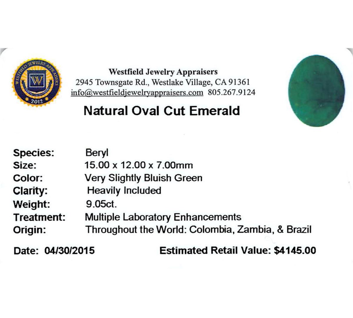 One oval cut natural emerald, measuring 15.00 x 12.00 x 7.00mm, exact weight 9.05ct., clarity is heavily included, type III, medium dark, very slightly grayish, very slightly bluish green color, (GIA vslbG 6/3), cut is good. Westfield Appraised at $4,145.00.