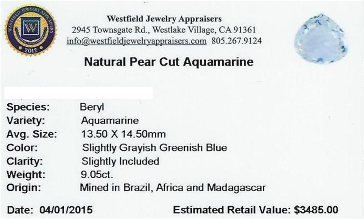 One pear mixed cut natural aquamarine exact weight 9.05ct., clarity is slightly included, type I, medium light, very slightly grayish, very slightly greenish blue color, (GIA vslgB 4/3), cut is good. Westfield Appraised at $3,485.00.