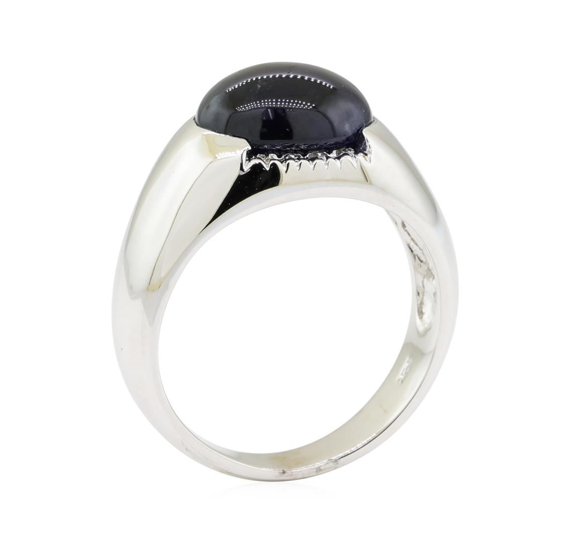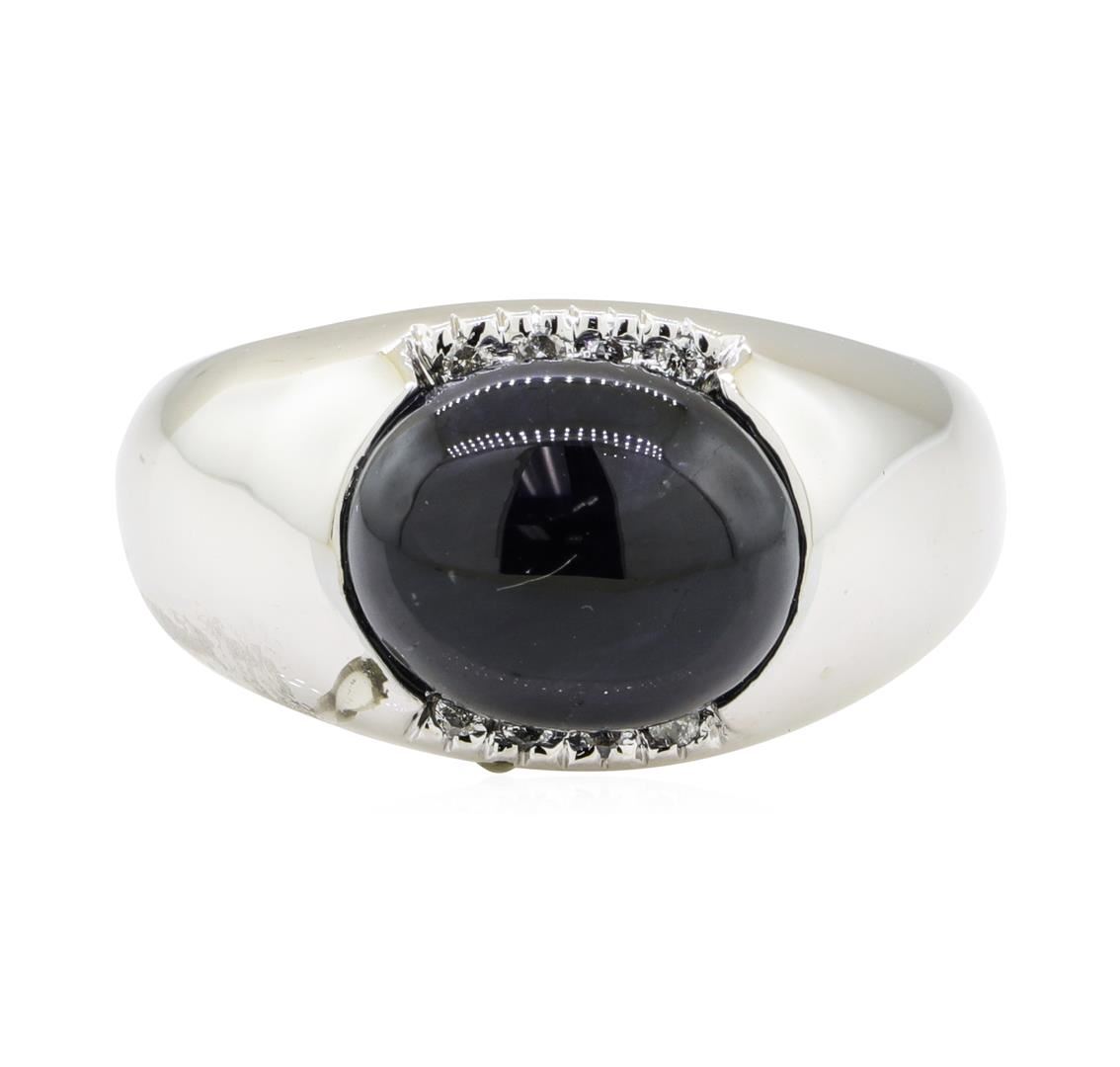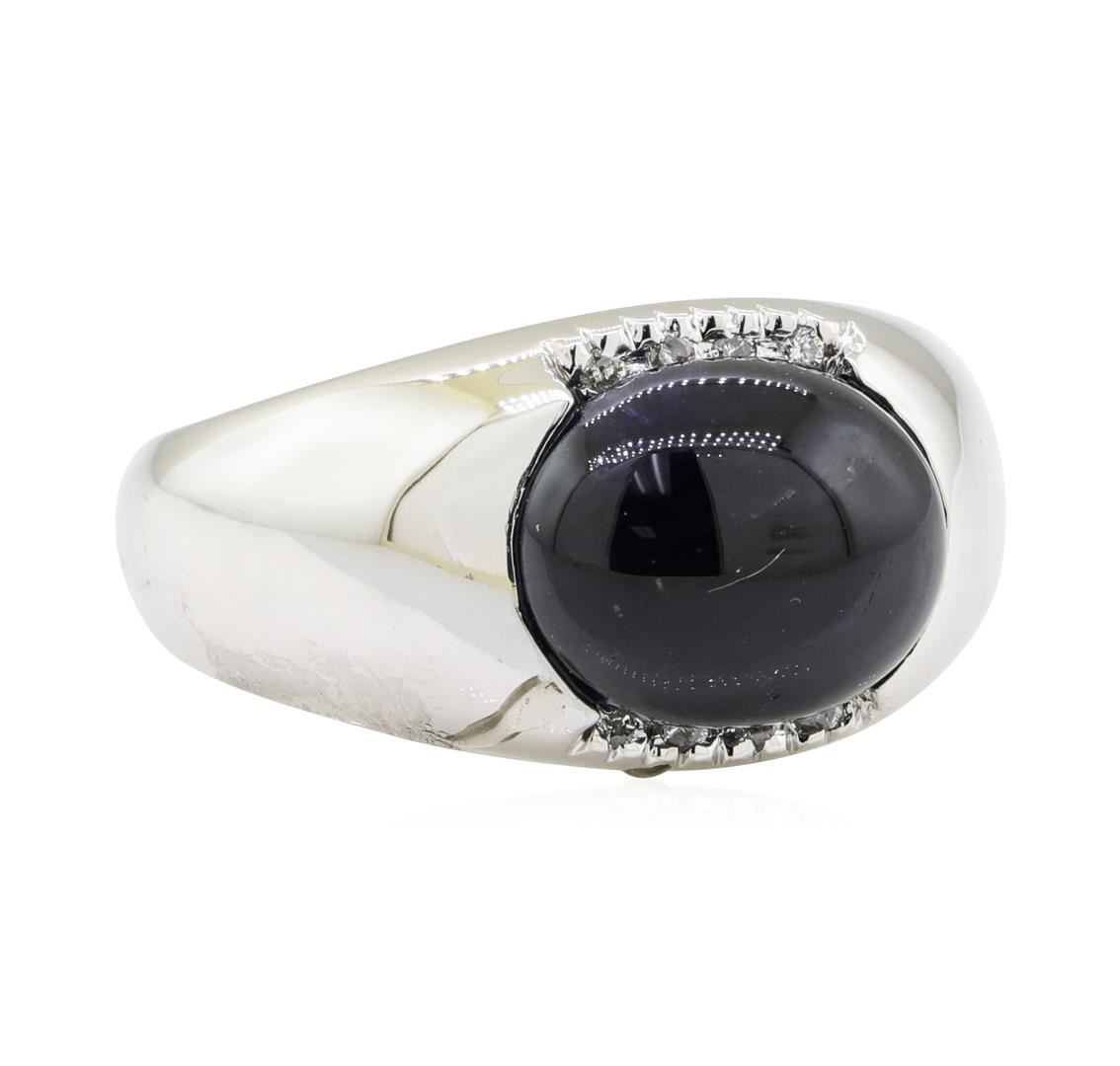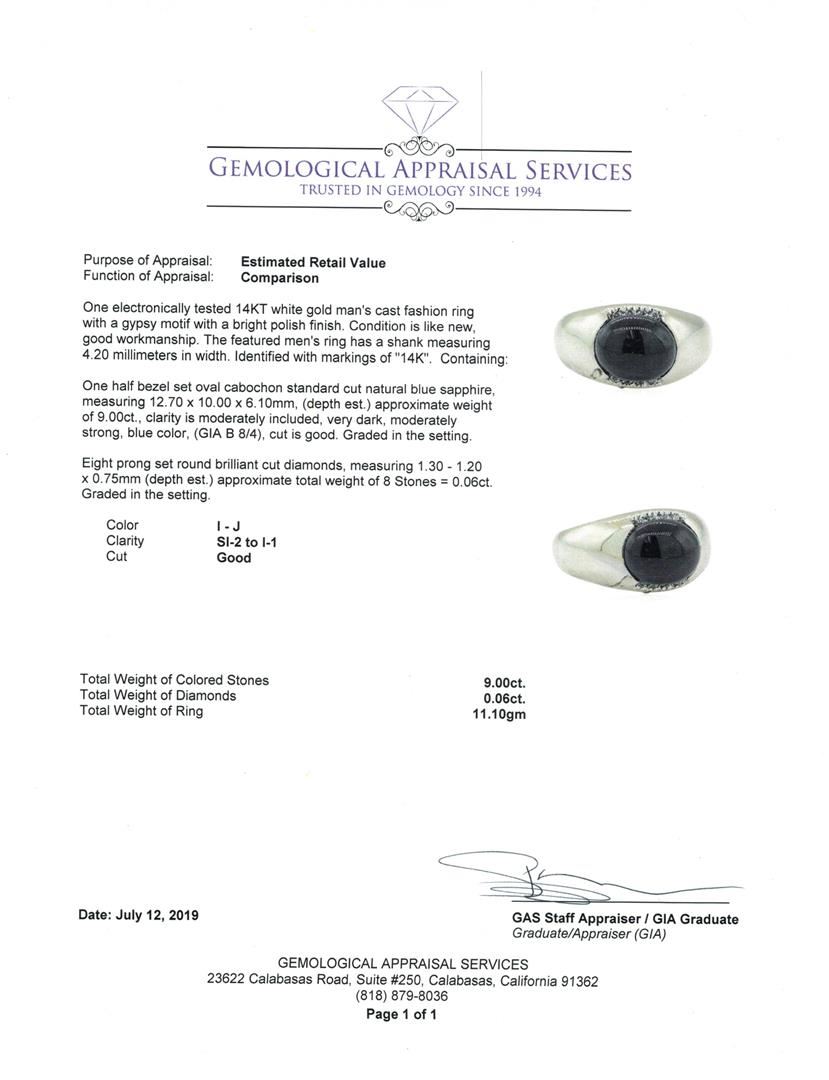 One electronically tested 14KT white gold man's cast fashion ring with a gypsy motif with a bright polish finish. The featured men's ring has a shank measuring 4.20 millimeters in width. Identified with markings of '14K'. Condition is like new, good workmanship. Containing: One half bezel set oval cabochon standard cut natural blue sapphire, measuring 12.70 x 10.00 x 6.10mm, (depth est.) approximate weight of 9.00ct., clarity is moderately included, very dark, moderately strong, blue color, (GIA B 8/4), cut is good. Graded in the setting. Eight prong set round brilliant cut diamonds, measuring 1.30 - 1.20 x 0.75mm (depth est.) approximate total weight of 8 Stones = 0.06ct. Graded in the setting. Color I - J Clarity SI-2 to I-1 Cut Good. Total Weight of Colored Stones 9.00ct.. Total Weight of Diamonds 0.06ct.. Total Weight of Ring 11.10gm GAS Appraised at $4735.00. GAS Appraised at $5,550.00.