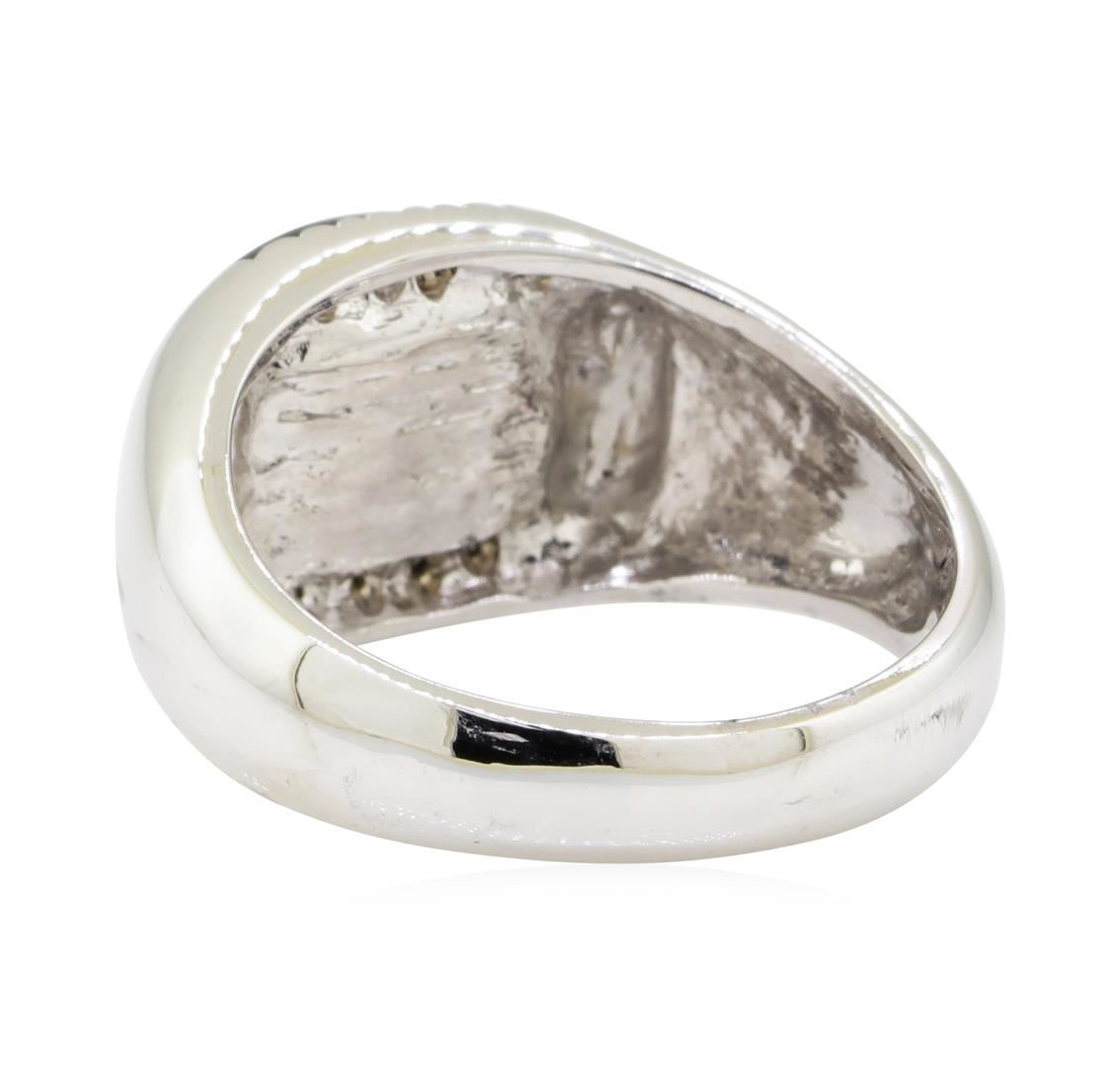 One electronically tested 14KT white gold man's cast fashion ring with a gypsy motif with a bright polish finish. The featured men's ring has a shank measuring 4.20 millimeters in width. Identified with markings of '14K'. Condition is like new, good workmanship. Containing: One half bezel set oval cabochon standard cut natural blue sapphire, measuring 12.70 x 10.00 x 6.10mm, (depth est.) approximate weight of 9.00ct., clarity is moderately included, very dark, moderately strong, blue color, (GIA B 8/4), cut is good. Graded in the setting. Eight prong set round brilliant cut diamonds, measuring 1.30 - 1.20 x 0.75mm (depth est.) approximate total weight of 8 Stones = 0.06ct. Graded in the setting. Color I - J Clarity SI-2 to I-1 Cut Good. Total Weight of Colored Stones 9.00ct.. Total Weight of Diamonds 0.06ct.. Total Weight of Ring 11.10gm GAS Appraised at $4735.00. GAS Appraised at $5,550.00.