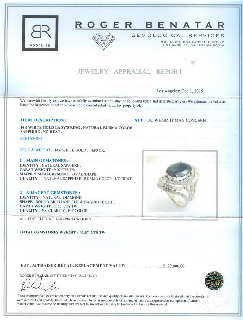 One 14KT White Gold Lady's Ring. Natural Burma Color Sapphire. No Heat. Containing: Gold & Weight: 14KT White Gold, 14.90 grams. Main Gemstones: Identity: Natural Sapphire. Carat Weight: 9.07 cts tw. Shape & Measurement: Oval Shape. Quality: Natural Sapphire. Burma Color. No Heat. Adjacent Gemstones: Identity: Natural Diamond. Shape: Round Brilliant Cut & Baguette Cut. Carat Weight: 2.50 cts tw. Quality: VS Clarity, E-F Color. All fine cutting and proportions. Total gemstones weight: 11.57 cts tw. RBGS Appraised at $20,000.00.
