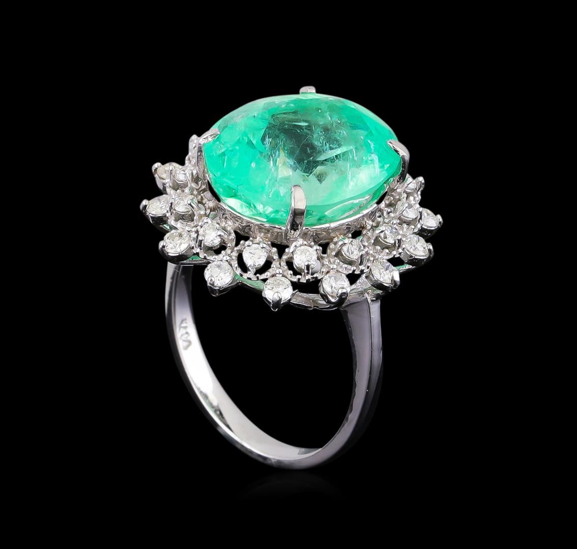 One electronically tested 14KT white gold lady's cast fashion ring with a double basket halo with a bright polish finish. The featured lady's ring has a shank measuring 2.36 millimeters in width. Identified with markings of "K14". Condition is new, good workmanship. Containing: One prong set oval modified brilliant cut natural emerald, measuring 14.85 x 12.19 x 8.89mm, (depth est.) approximate weight of 9.08ct., clarity is moderately included, medium light, moderately strong, green color, (GIA G 4/4), cut is very good. Transmitting light with a minimum of distortion, transparent. Colored gemstones are presumed to have been subjected to commonly used enhancement processes. Indications of oil residue. Graded in the setting. Fourteen prong set round brilliant cut diamonds, measuring 2.10 - 2.00 x 1.27mm (depth est.) approximate total weight of 14 Stones = 0.45ct. Graded in the setting. Clarity: SI-1 to SI-2. Color: G - Good Fourteen prong set round brilliant cut diamonds, measuring 1.80 - 1.70 x 1.07mm (depth est.) approximate total weight of 14 Stones = 0.28ct. Graded in the setting. Clarity: VS-2 to SI-2. Color: G - Good. Total Weight of Colored Stones 9.08ct. Total Weight of Diamonds 0.73ct. Total Weight of Ring 6.50gm GAS Appraised at $21,270.00.