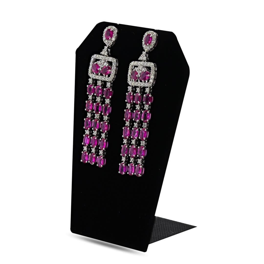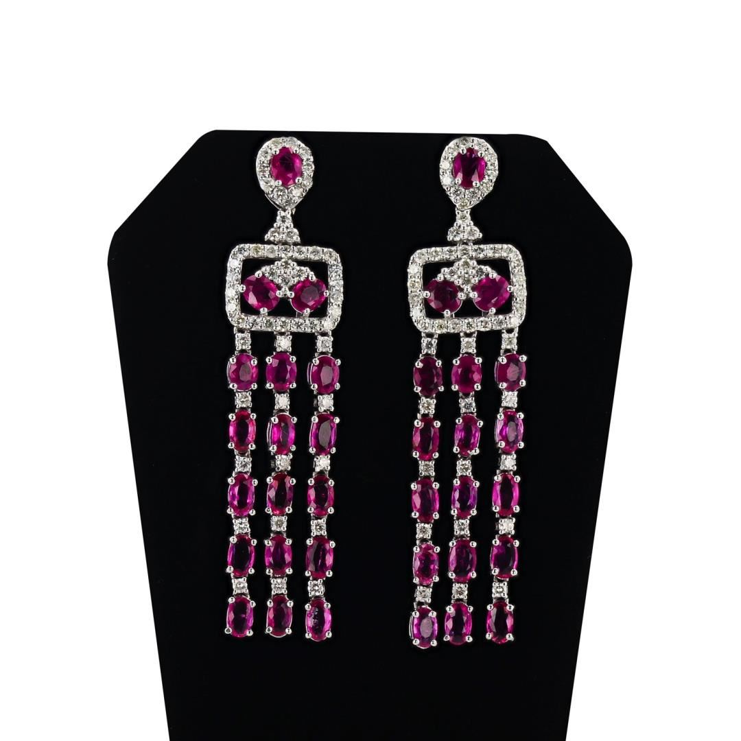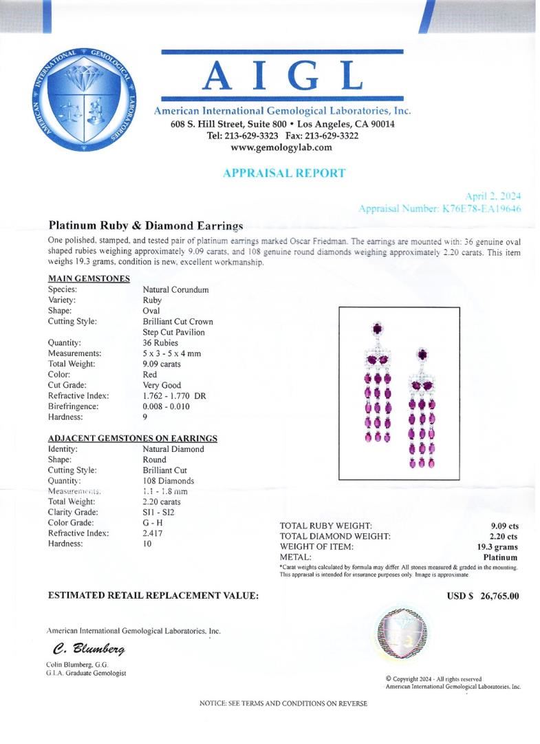 One polished. stamped. and tested pair of platinum earrings marked Oscar Friedman. The earrings are mounted with: 36 genuine oval shaped rubies weighing approximately 9.09 carats. and 108 genuine round diamonds weighing approximately 2.20 carats. This ite