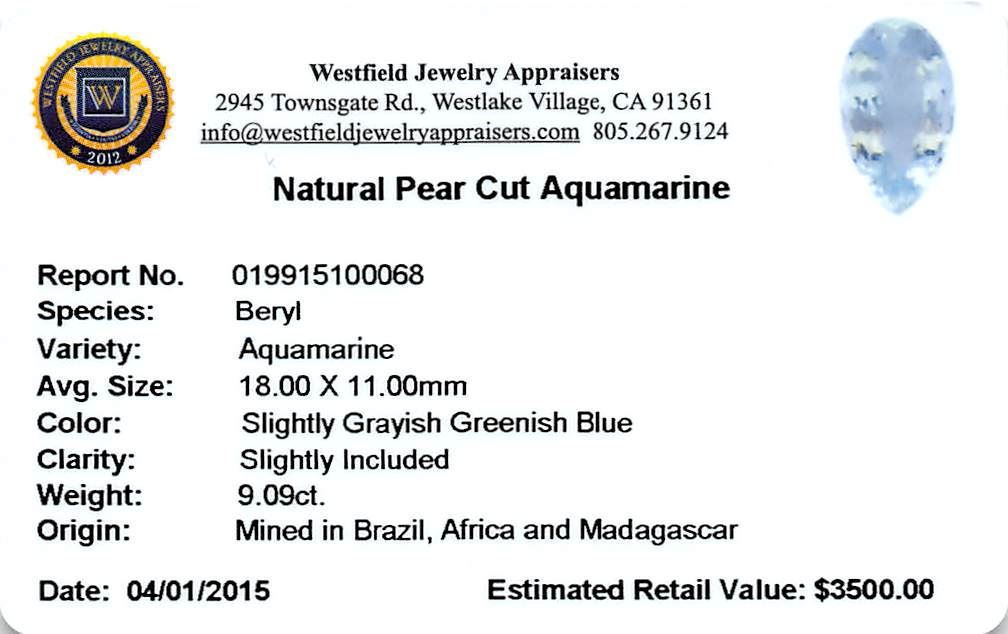 One pear cut natural aquamarine exact weight 9.09ct., clarity is slightly included, type I, medium, very slightly grayish, very slightly greenish blue color, (GIA vslgB 5/3), cut is good. Westfield Appraised at $3,500.00.