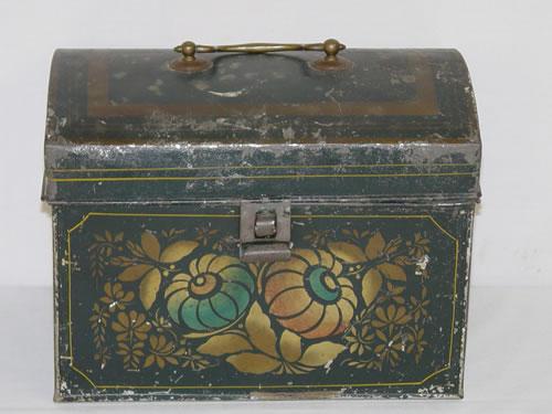 9 1/2" 19TH CENT. TOLEWARE DOME TOP DOCUMENT BOX W/ BRASS BAIL HANDLE W/ POLYCHROME FLORAL STENCILED DECORATION - PAINT LOSS, IMPERFECTIONS
