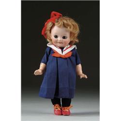 9 1/2” A.M. 323 GOOGLEY. A fine larger sized A.M. googley on a high quality composition body with straight wrists and starfish hands. Doll features blue glass set eyes and blonde human hair wig. The impish grin and side glancing eyes make this a most appealing doll. Clothing is not original to doll. SIZE: 9 1/2”. CONDITION: Composition body near mint condition; a faint hairline is present on forehead. JL 1-4629 (400-600)